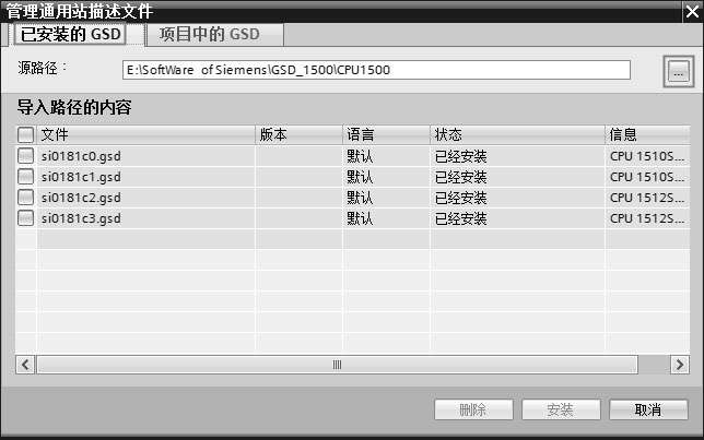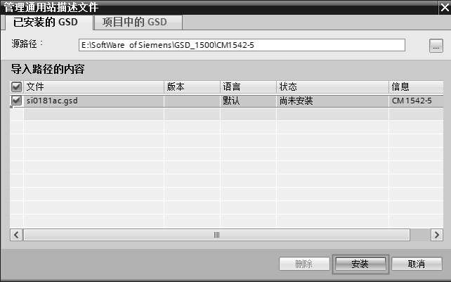 ,在本计算机中找到存放GSD文件的位置,本例GSD文件存放位置如图3-104所示界面,选中需要安装的GSD文件,单击“安装”按钮。