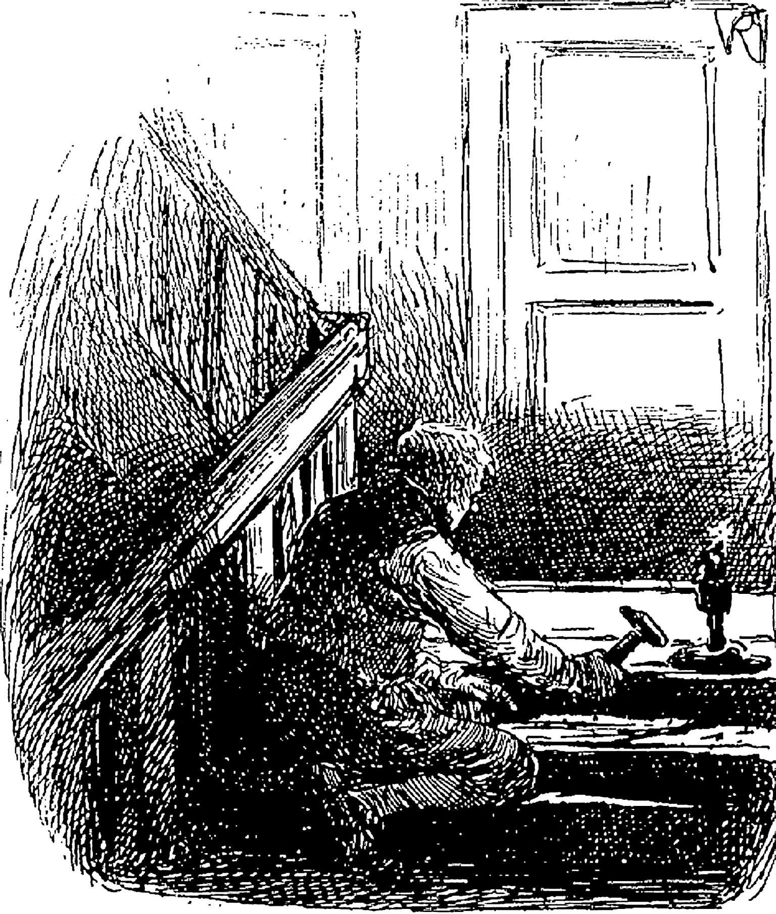 大个子娜侬坐在炉火前,点着一支蜡烛,准备织麻,不参加节庆活动。葛朗台从通往厨房的过道门那里看到了她。