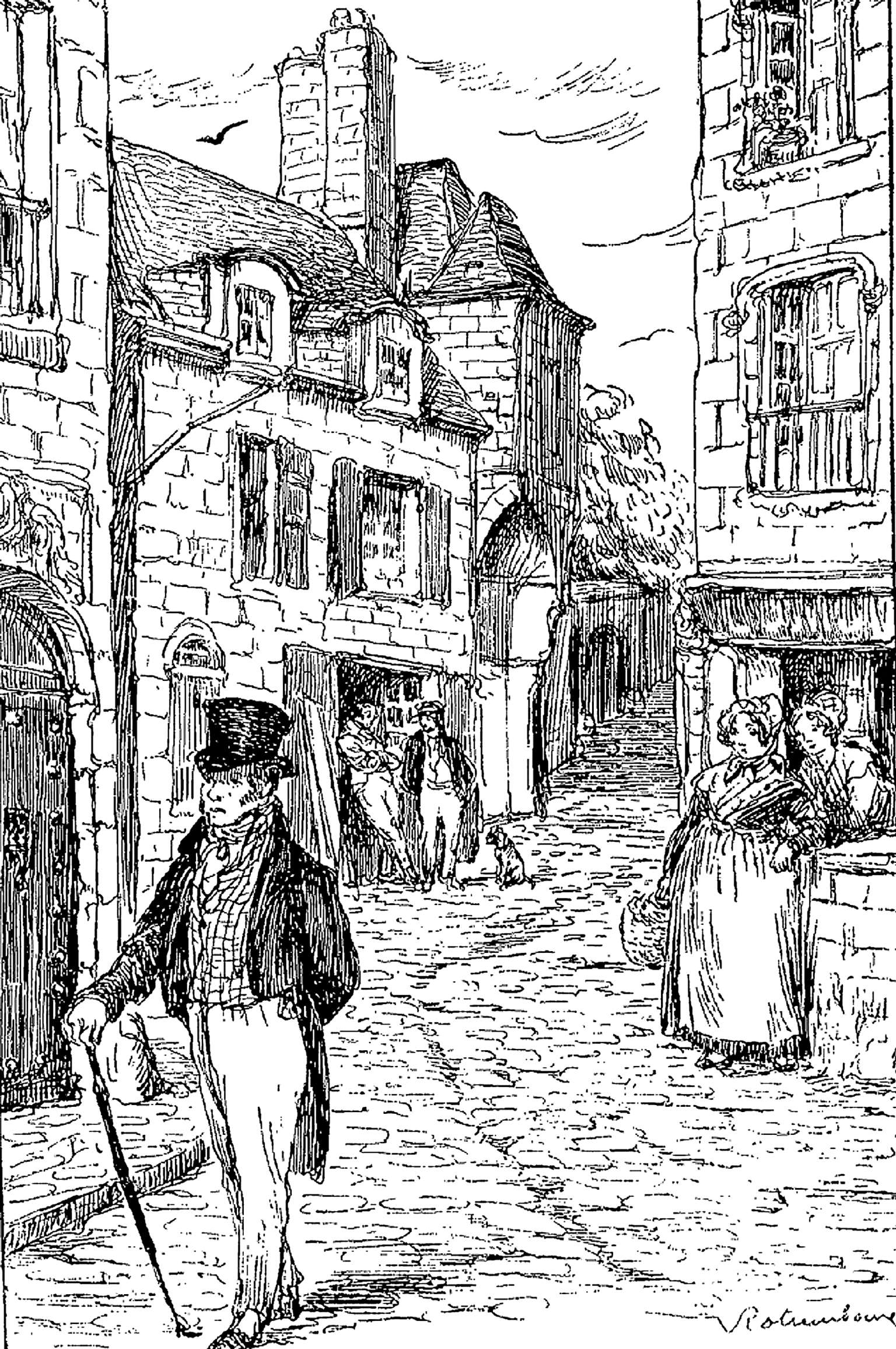 老城那些老宅位于这条街的高处,当地贵族昔日都住在这条街上。这些房子是世道人心具有淳朴特点的时代的古老遗物,但如今法国已世风日下,这个故事正是发生在其中一幢相当阴暗的房子里。在这条古色古香的街道上,任何小事都能引起回忆,总体印象使人不禁陷入遐想;在曲里拐弯地走过一段路以后,你可以看到一个阴森森的凹进去的地方