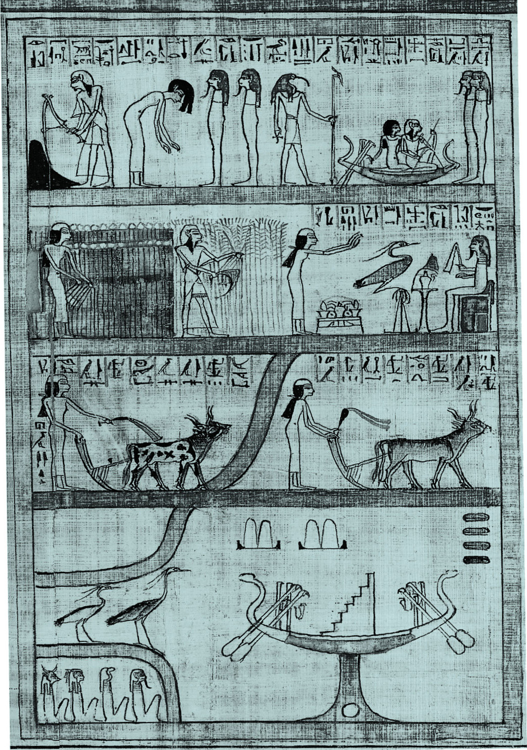 也许你在死亡中见过的最熟悉的地方就是芦苇地,《亡灵书》的咒语 109、110 对此地有着详细的描述和说明。这里有一部分地方是留给你的。穿过阻止不配进入者的大铁墙,作为包括太阳神的船在内的船队中的一员的你,乘船抵达了芦苇地。下船后,你会发现两棵大绿松石树,每天太阳从这两棵树中间升起。你向众神中的大九神团表达你的敬意,能亲自见到他们,你深感荣幸。然后,你沿着河流驶向你的农田,在这期间你通过许多丘陵和水路,其中一条水路名为“白色河马的水路”。你的《亡灵书》告诉你,这个地方有“一千里格(约 3900 至 7400 千米——编注)长,它的宽度未知。里边没有鱼,里面也没有蛇” 9 。当你沿着河流漂流时,你还会注意到被称为“净化女神之角”的水道,它的长度和宽度各有一千里格。