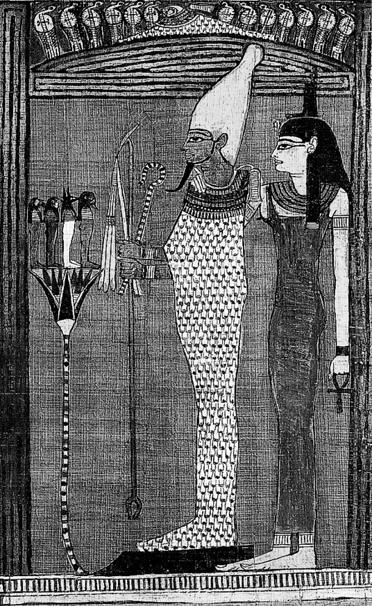 奥西里斯(紧紧包裹得像木乃伊)和伊西丝站立在荷鲁斯的四个儿子面前。