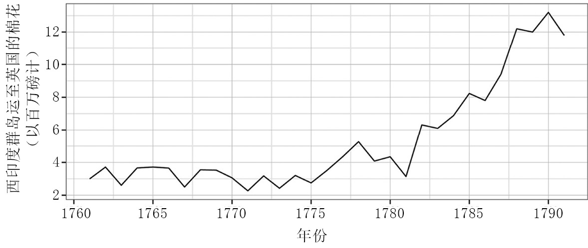 加勒比棉花革命:1750—1795年西印度群岛向联合王国运送的棉花(以百万磅计)。