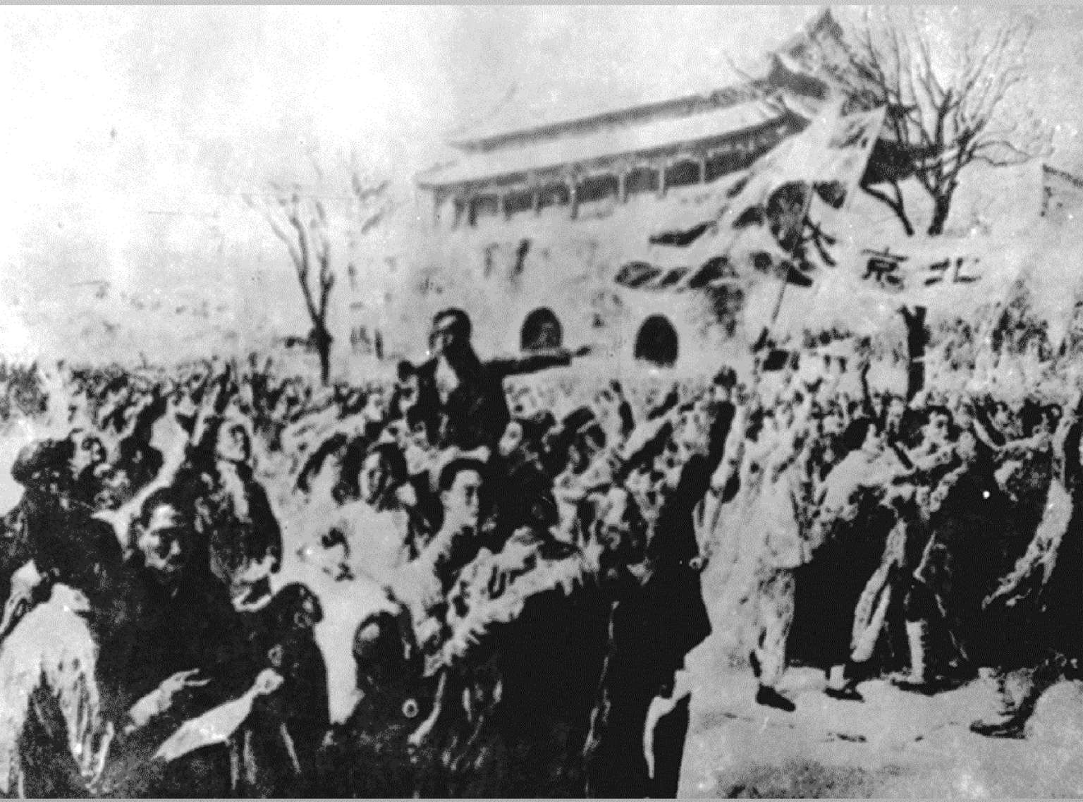 5月4日下午,北大等十几所学校3 000余名学生聚集天安门广场,喊出了“外争国权,内惩国贼”、“废除二十一条”、“誓死力争”、“还我青岛”等口号。