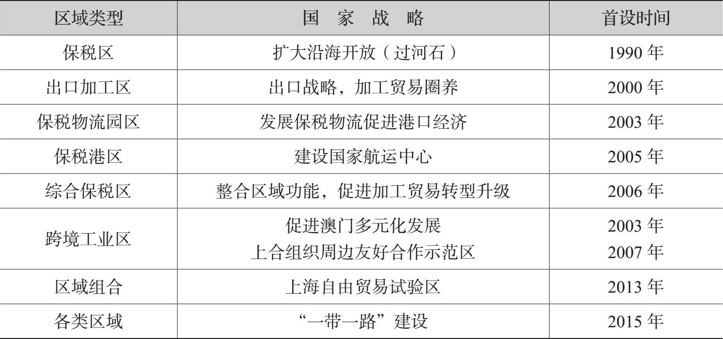 作为中国第一个海关特殊监管区域,上海外高桥保税区还对其他类型的海关特殊监管区域的设立起到示范作用。保税区的设立服务于“扩大沿海开放”的国家战略,并以此为起点,不断拓展和丰富海关特殊监管区域的类型模式,服务于不同的国家战略。当前,海关特殊监管区域已经发展至六种类型:保税区、出口加工区、保税物流园区、跨境工业区、保税港区和综合保税区,不同的类型服务于不同的国家战略(见表2-18-6)。