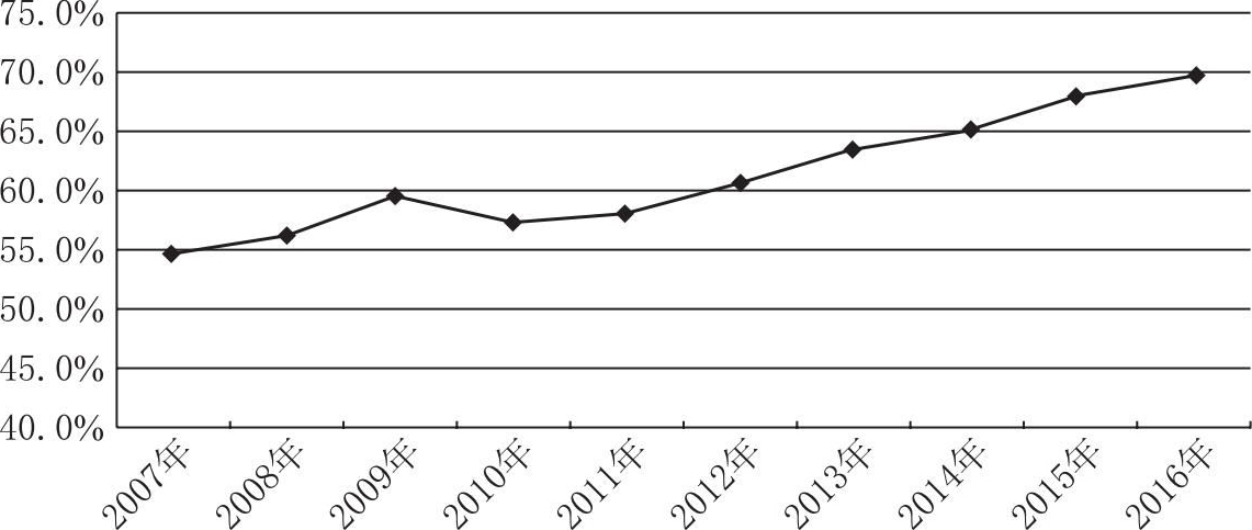 “营改增”的实施能够推动经济结构调整,推动第三产业发展。这是因为,“营改增”能够避免服务业重复征税现象,减轻服务业税务负担,对推动形成以服务经济为主的产业结构有着至关重要的作用。“营改增”对服务业影响的具体机制主要是:通过对服务业产生直接减税效应;通过服务业对下游企业开具增值税由下游企业抵扣,减轻下游企业税负来拉动服务业发展;通过生产企业内部服务部门独立出来进行运营以及服务业外包来扩大服务规模。“营改增”于2012年试点推广之前,上海第三产业产值占GDP比重在55%~60%浮动,而至2012年“营改增”颁布以来,上海第三产业产值占GDP的比重一直保持稳定提升,说明“营改增”释放了服务业的活力,对上海产业结构调整起到了促进作用(见图1-6-1)。