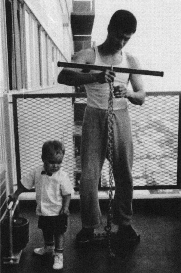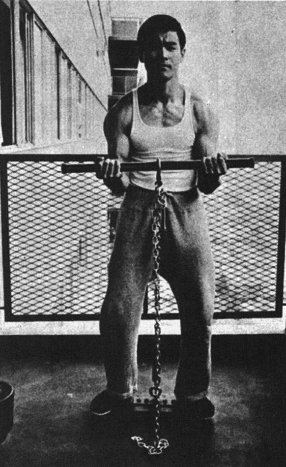 除了使用深蹲架之外,李小龙还喜欢采用一种便携式的静力训练器械,这是他的弟子李鸿新专门为他制作的。这种器械可以让他对固定目标进行推、拉、压、弯曲等练习。上图显示了李小龙正在调整该器械的横杠位置,横杠系在一条铁链上,铁链的另一头连着一块木板,李小龙站在木板之上以使其固定不动。