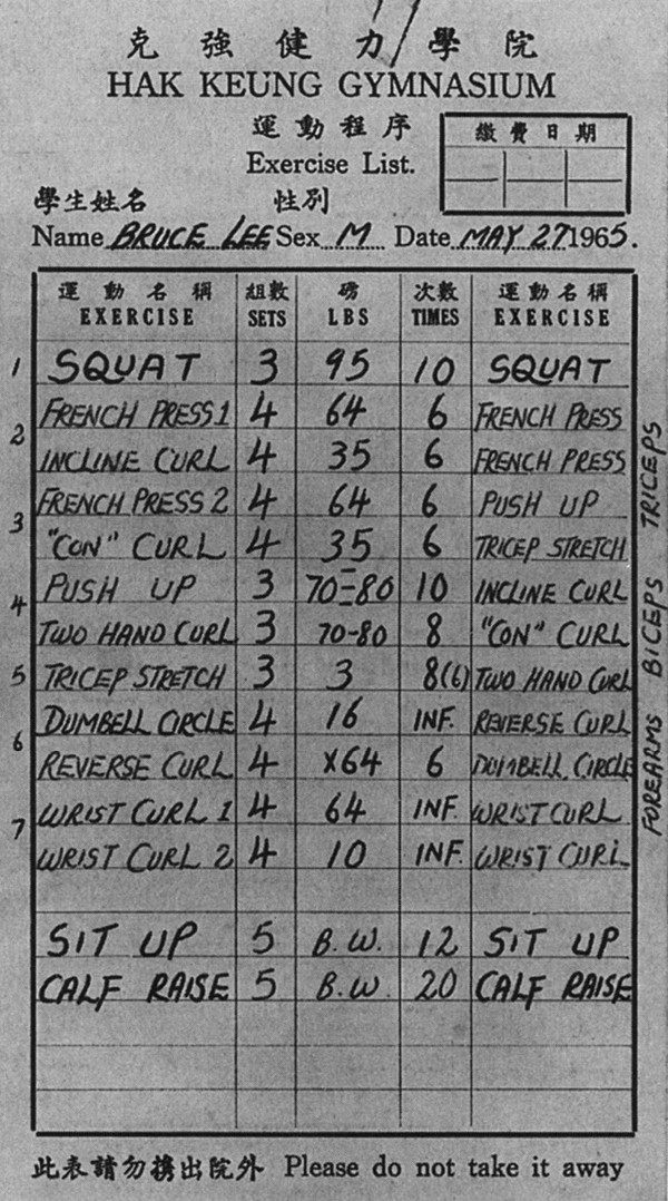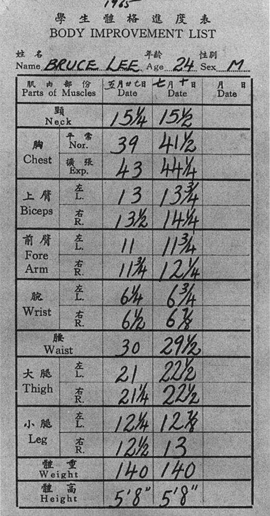 李小龙制定了一个简单的、每周3天的健身训练计划,专门针对武术中常用的肌肉群:腿部肌群、肱三头肌、肱二头肌、前臂肌群等。令李小龙感到兴奋的是,他的计划取得了令人难以置信的效果。效果究竟有多好?在44天之内(从1965年5月27日到1965年7月10日),一共经过了14次训练之后,李小龙的进步记录如下: