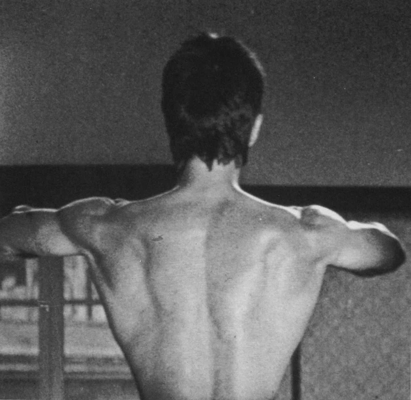 李小龙拥有线条极为突出的背肌(专业术语为上背部的背阔肌)和漂亮的“V”字形身材。无疑,这一部分是先天条件所致,李小龙天生拥有较宽的肩膀和较细的腰身,即倒锥形身材。不过,要想保持并加强背肌仍然需要严格的训练。以下是李小龙强化自己背阔肌与背部其他肌群的训练方法。