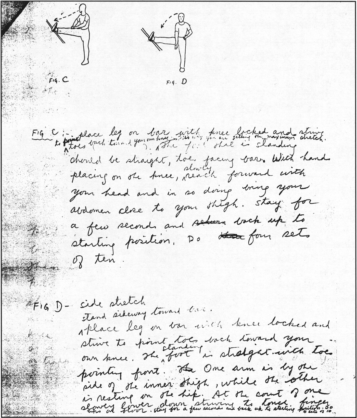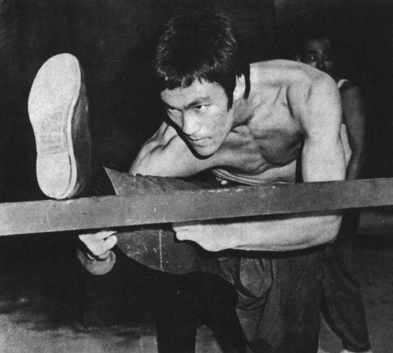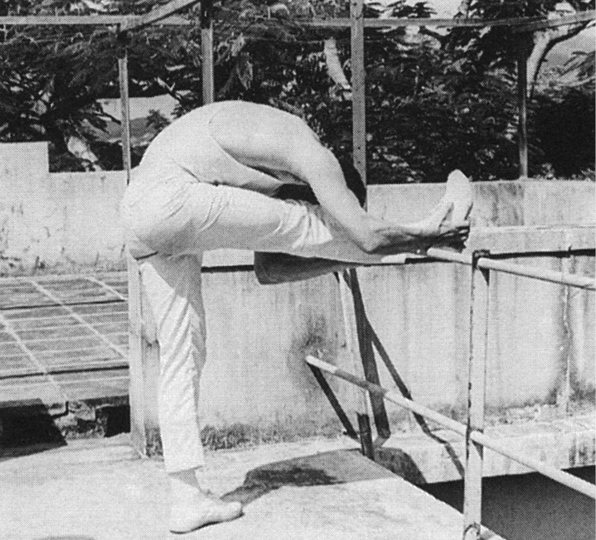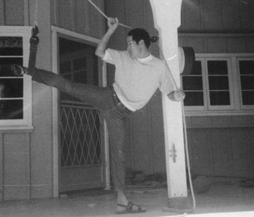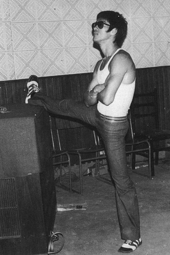 即使李小龙在为电影配音时,他的姿势也与众不同,他一只脚放在工作室的椅背上,另一条腿直立,身体向前弯曲,保持腿后部肌腱处于被拉伸的状态。在他家中的工作室里,有一个特制的拉伸杆,可以任意调节自己想要的高度,然后用两个销栓将其固定起来。得益于这个设备,即使是李小龙在看电视或者看书时,他都可以做一些简单的腿部伸展练习。事实上,在李小龙的训练计划中,身体柔韧性的练习和有氧健身训练的比重是大致相当的。