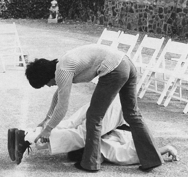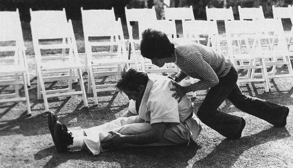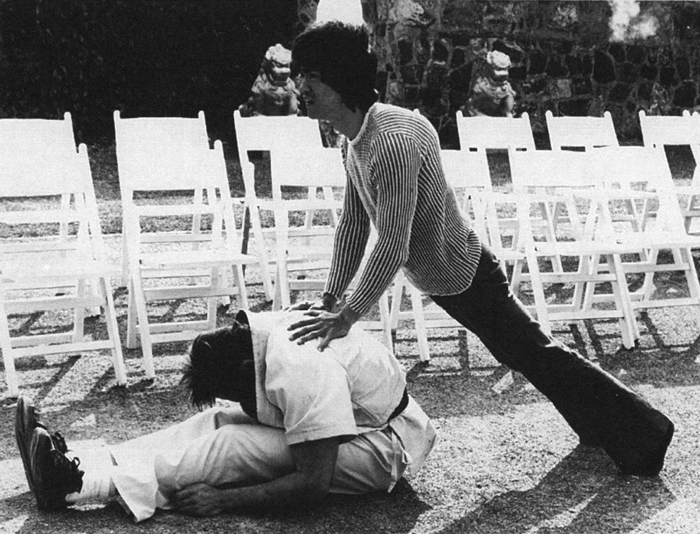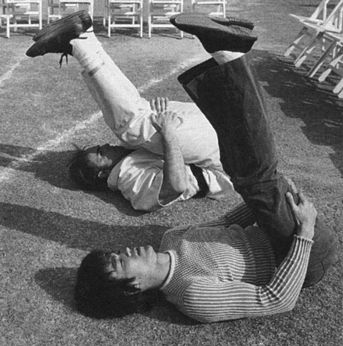 在进行训练或者格斗之前,他固定、唯一且例行的练习便是伸展运动。一种从来没见过别人做过的伸展运动让我记忆犹新:我和他背靠背坐在地板上,他用肩膀用力推压我的肩膀,最后,我的脑袋都快接触到地板了。这样可以锻炼腿部的柔韧性,双方轮流进行,这是一种拉伸腿后部肌腱(腘绳肌腱)的运动。