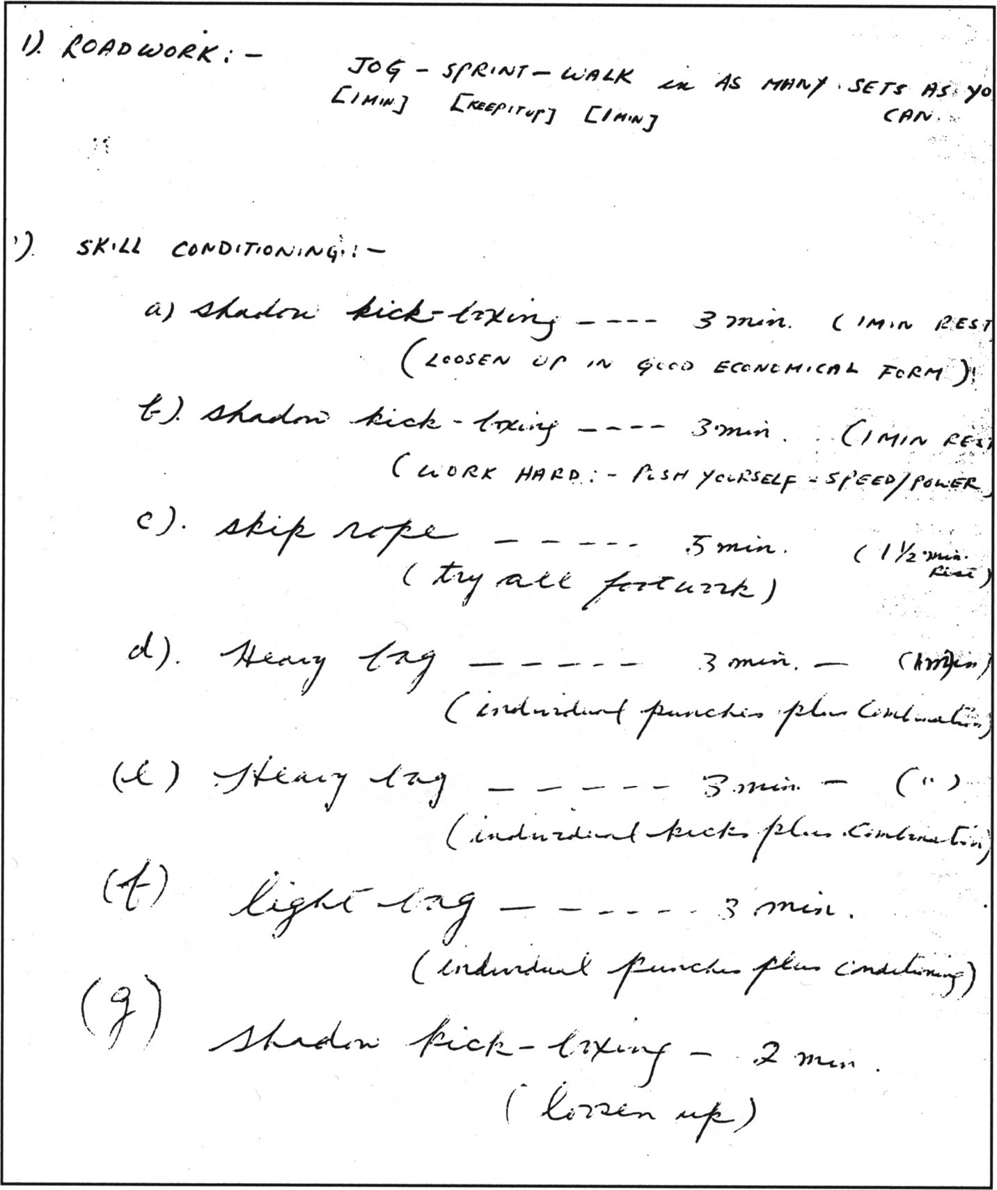 在一段时间后,李小龙会改变他的训练计划,让自己在一个为期6天的时间段里,更集中地进行训练,尤其是在拳法和踢法方面。在新的训练计划中,他在星期一、星期三和星期五练习上肢;星期二、星期四和星期六则训练下肢。尽管他并没有记录下他每一轮的具体训练时长,但是根据他之前的训练计划,我们可以推断出每个“循环”的时间是3分钟,同时有1分钟的休息时间。