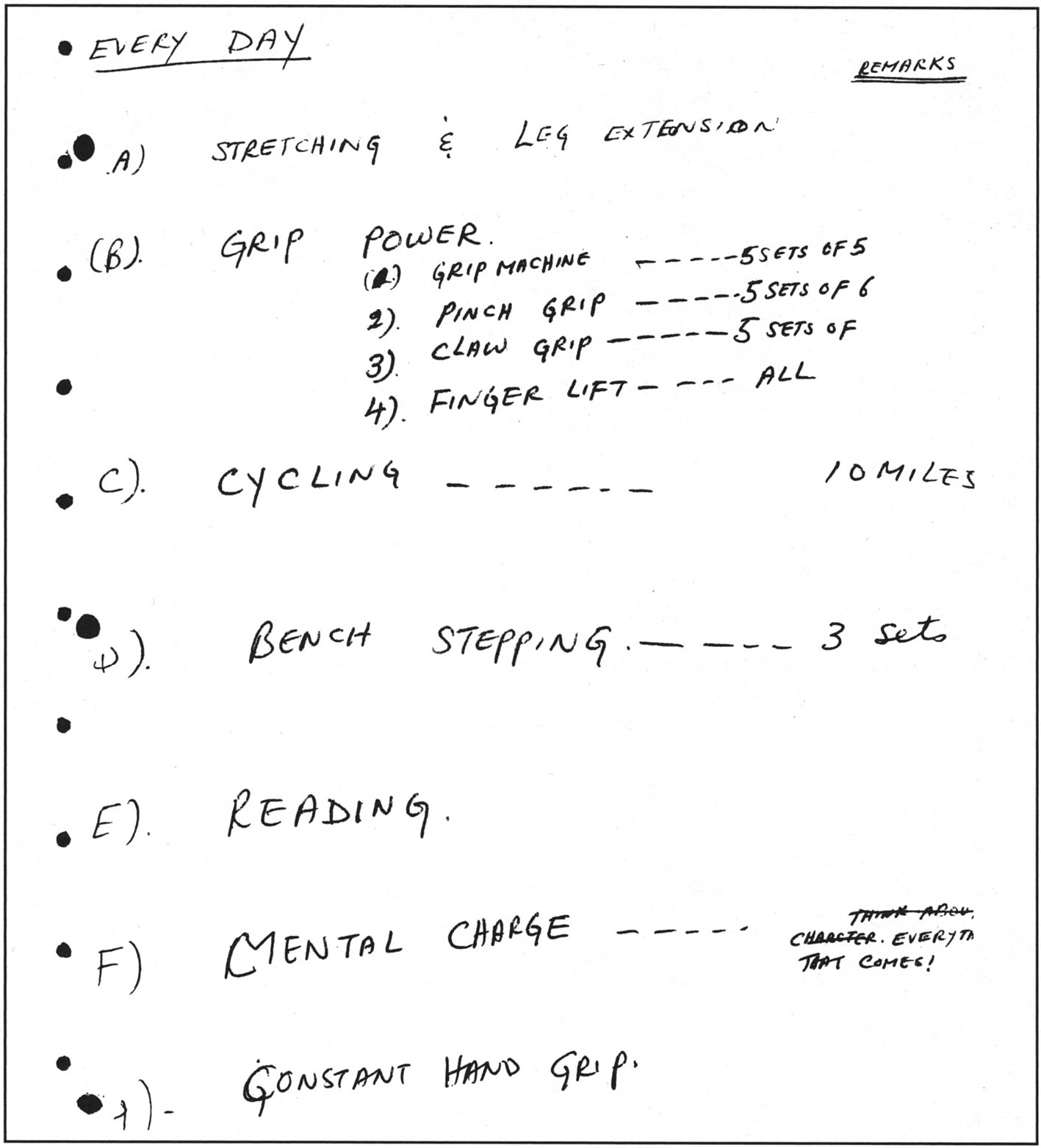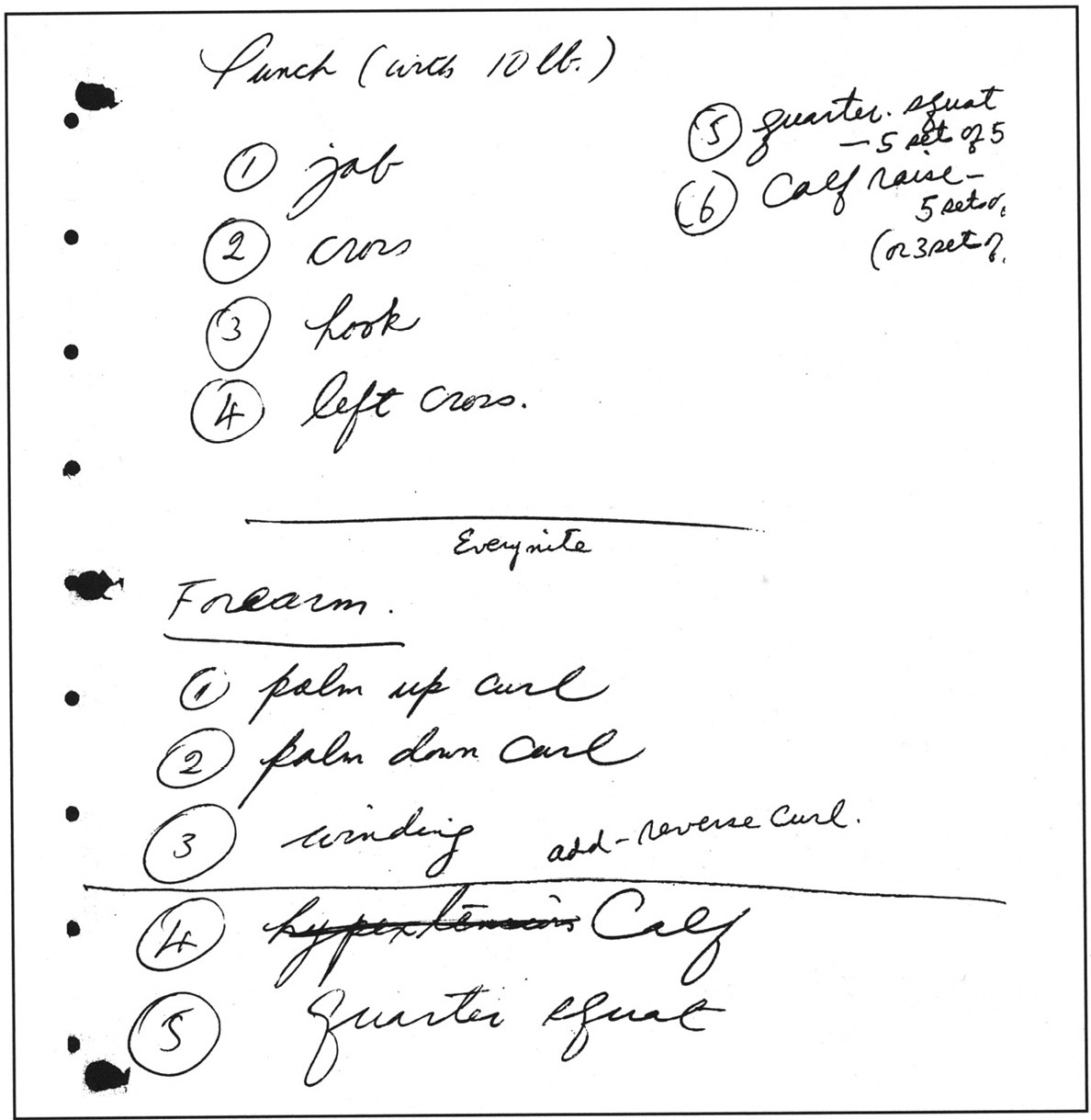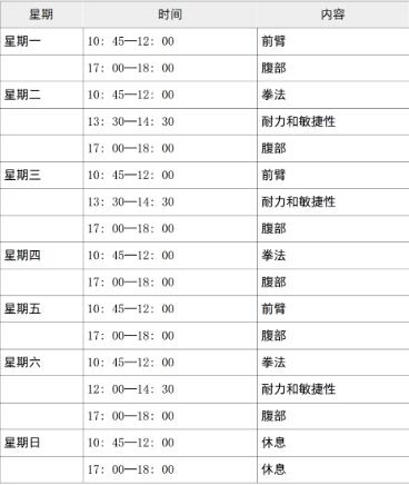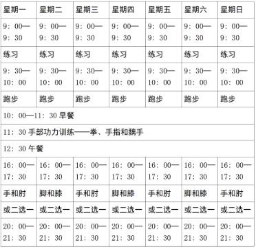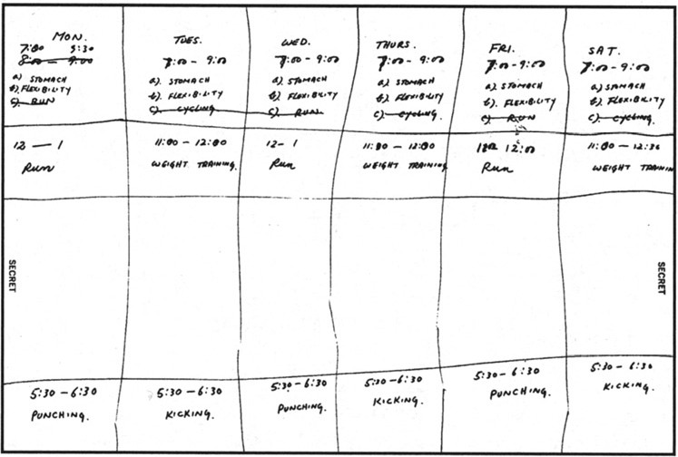 到了1970年,他的训练计划就已经进化成完美、高效的现代交叉训练计划的示例:负重训练培养力量,跑步和骑健身自行车改善心血管机能,伸展运动提升身体的柔韧性,重沙袋练习掌控时机和劲力,速度沙袋用于培养节奏感和时机感,高低沙袋训练锻炼协调性和精准性。更进一步的是,他科学分解了自己的训练计划,使之能够更好地集中于截拳道最核心的技术内容,如星期一、星期三、星期五练习手法,星期二、星期四和星期六则练习腿法等。
