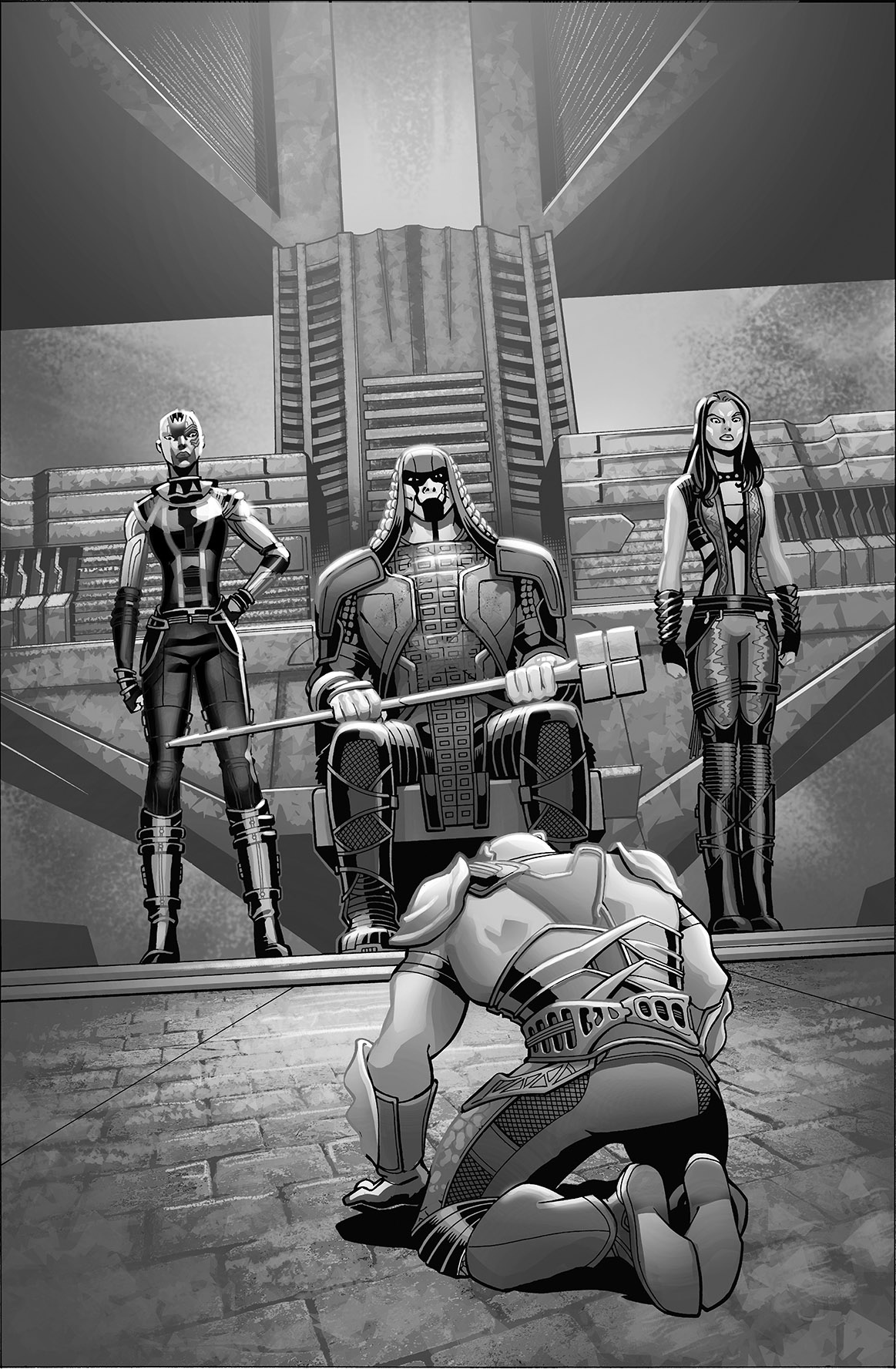 This speech was addressed to a prisoner, who knelt in the chamber, his upper body immobilized by a heavy steel collar around his neck. He could barely turn his head. The prisoner was an officer of the Nova Corps, the Xandar-based law enforcement agency that policed the sector. Fully dressed in his armor and the cowl of his office, Ronan turned to face the prisoner, who glared defiantly up at him.