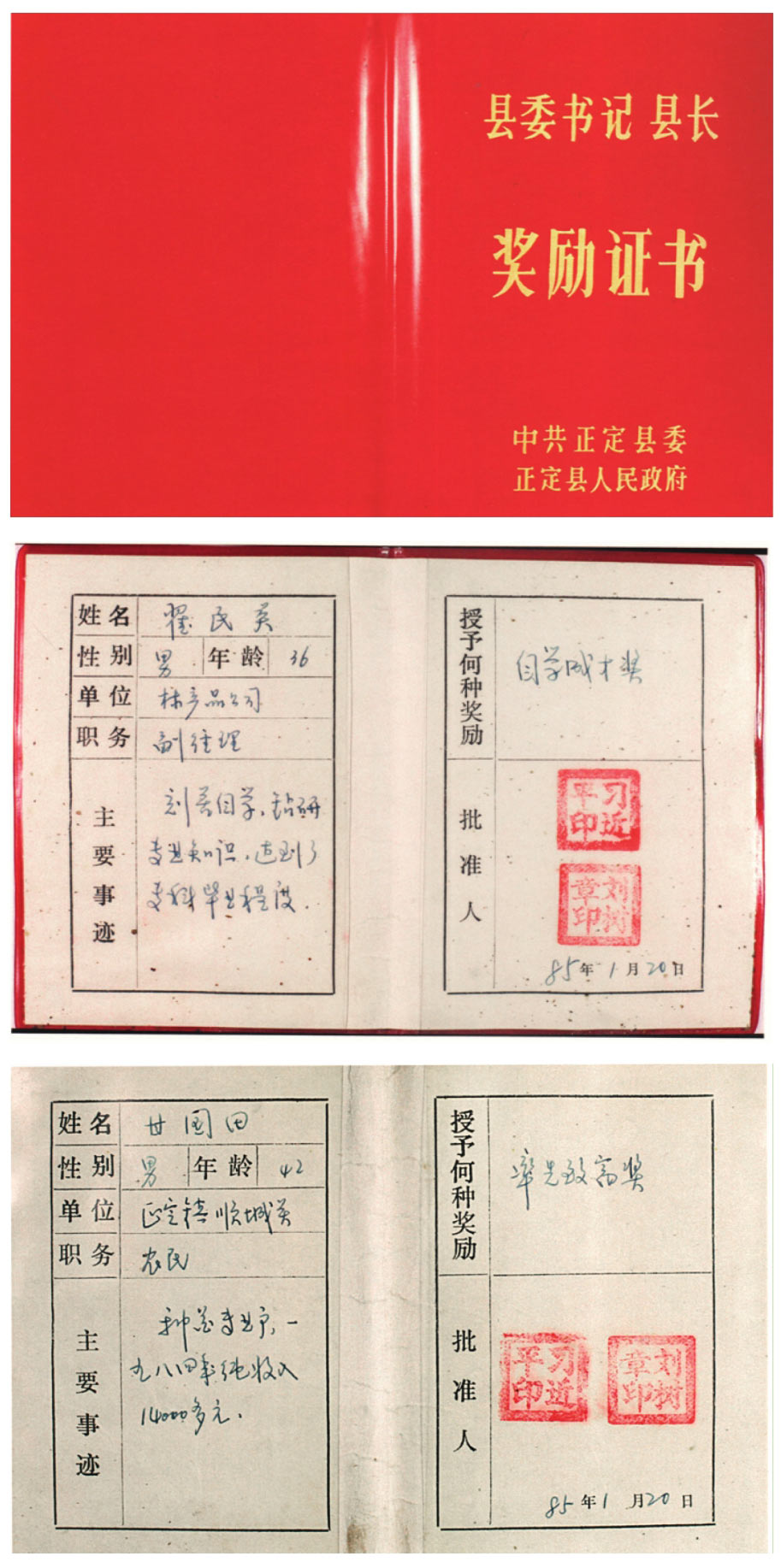 习近平任正定县委书记期间,重视发挥人才作用。上图为1985年为优秀人才颁发的“自学成才奖”“率先致富奖”,鼓励人才钻研专业知识,率先致富。