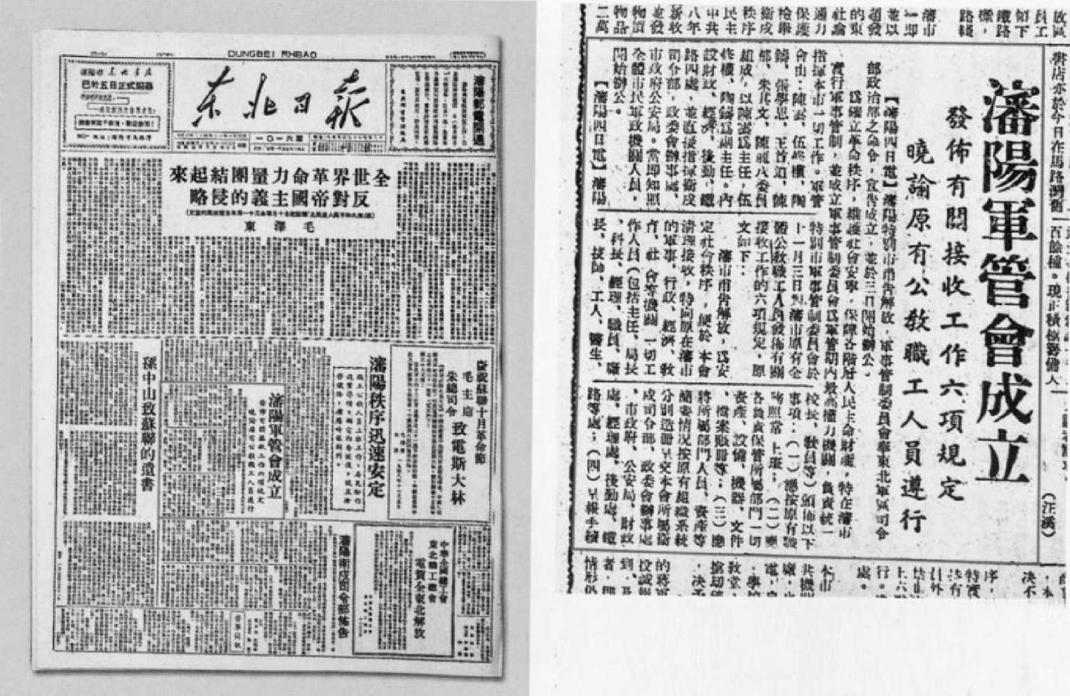 1948年11月7日,《东北日报》上刊登的以陈云为主任的沈阳军管会成立