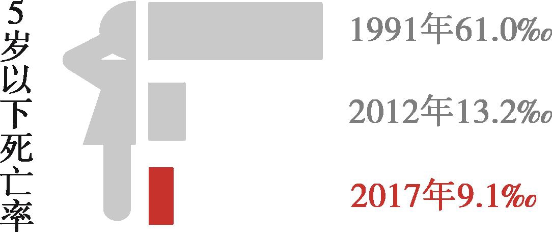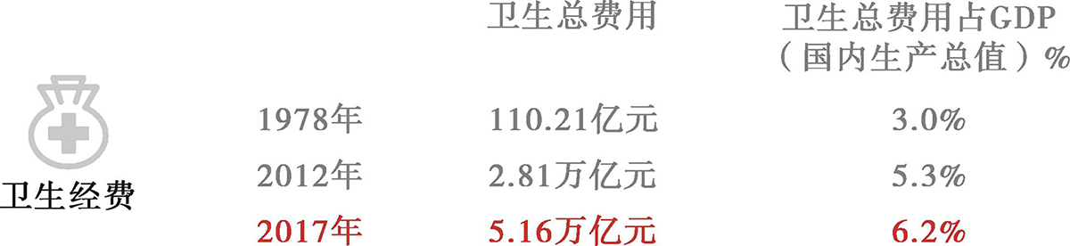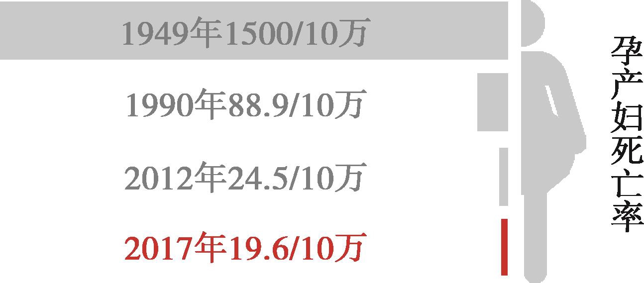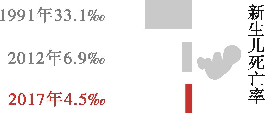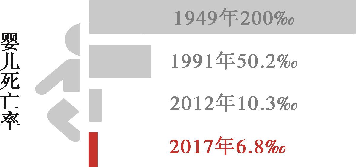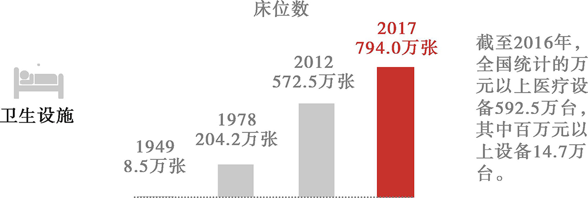 [数据来源:《2017年我国卫生健康事业发展统计公报》、《2017中国卫生和计划生育统计年鉴》、2017版《国家基本医疗保险、工伤保险和生育保险药品目录》、《2017年国家医疗服务与质量安全报告》、《中国心血管病报告2017》概要、《中国健康事业的发展与人权进步》白皮书、《发展权:中国的理念、实践与贡献》白皮书、《中国的医疗卫生事业》白皮书、《“十三五”深化医药卫生体制改革规划》、《“健康中国2030”规划纲要》、《中国居民营养与慢性病状况报告(2015)》、《中国妇幼卫生事业发展报告(2011)》、《中国统计摘要2009》、《2008中国卫生统计年鉴》、《中国历年卫生机构数和床位数统计(1949—2004)》、《1991年全国新生儿死亡情况分析》、《建国60年政府卫生投入和卫生总费用核算的回顾与展望》、中华人民共和国中央人民政府官网、国务院新闻办公室官网、国家卫生健康委员会官网、国家统计局官网、The Lancet、The Lancet Global Health等]