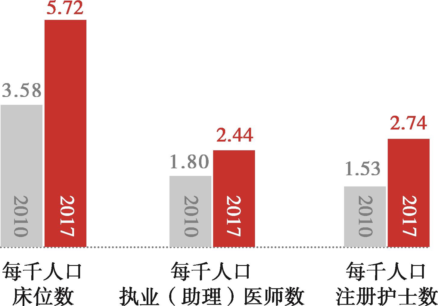 1.每千人口执业(助理)医师、注册护士数及床位数持续增长。截至2017年,每万人口全科医师数提高到1.82人。