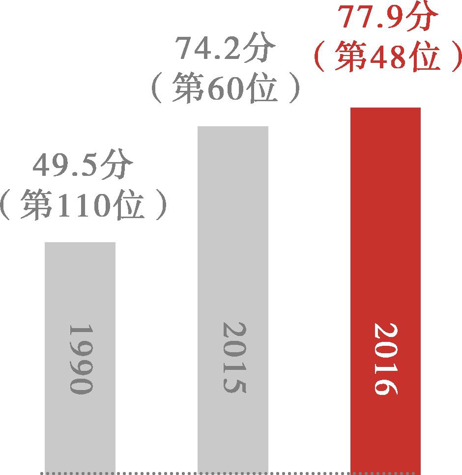 2017年《柳叶刀》(The Lancet)杂志发布了195个国家或地区医疗服务可及性及质量(HAQ)指数报告,全球HAQ指数从1990年的40.7分升至2015年的53.7分,中国则从1990年的49.5分(第110位)升至2015年的74.2分(第60位),成为全球HAQ指数增幅最大的五个国家之一。2018年《柳叶刀》杂志更新排名,我国的HAQ指数在2016年进一步提升至77.9分(第48位),一年间跃升了12位。