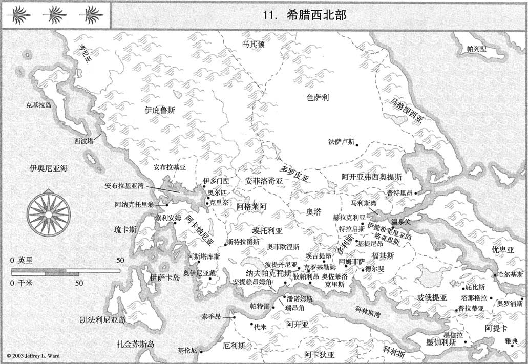 随后舰队北上,驶往阿卡纳尼亚(见地图11)。这已经不是伯罗奔尼撒人的领土,而属于科林斯的势力范围,因此雅典人的对策也不同。雅典人攻占了索利安姆(一座属于科林斯的城镇),然后将它托付给一些亲雅典的阿卡纳尼亚人驻守,一直到战争结束。雅典人还占领了阿斯塔库斯镇,将其并入自己的联盟。最后,他们兵不血刃地占领了凯法利尼亚岛,它的位置对阿卡纳尼亚、克基拉岛和琉卡斯岛(属于科林斯)来说具有战略意义。舰队随即返航,因为它已经完成了目标有限并受到严格控制的任务。