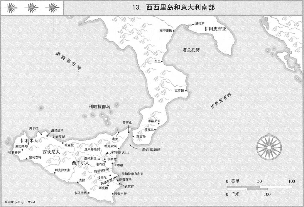(与墨西拿隔海相望,见地图13)建立了一个基地。雅典人打算完全控制墨西拿海峡,以阻止粮食按照正常路线从西西里岛抵达伯罗奔尼撒半岛。他们计划占领墨西拿城,作为西西里岛的希腊人,尤其是伊奥尼亚人,以及敌对叙拉古的土著西库尔人