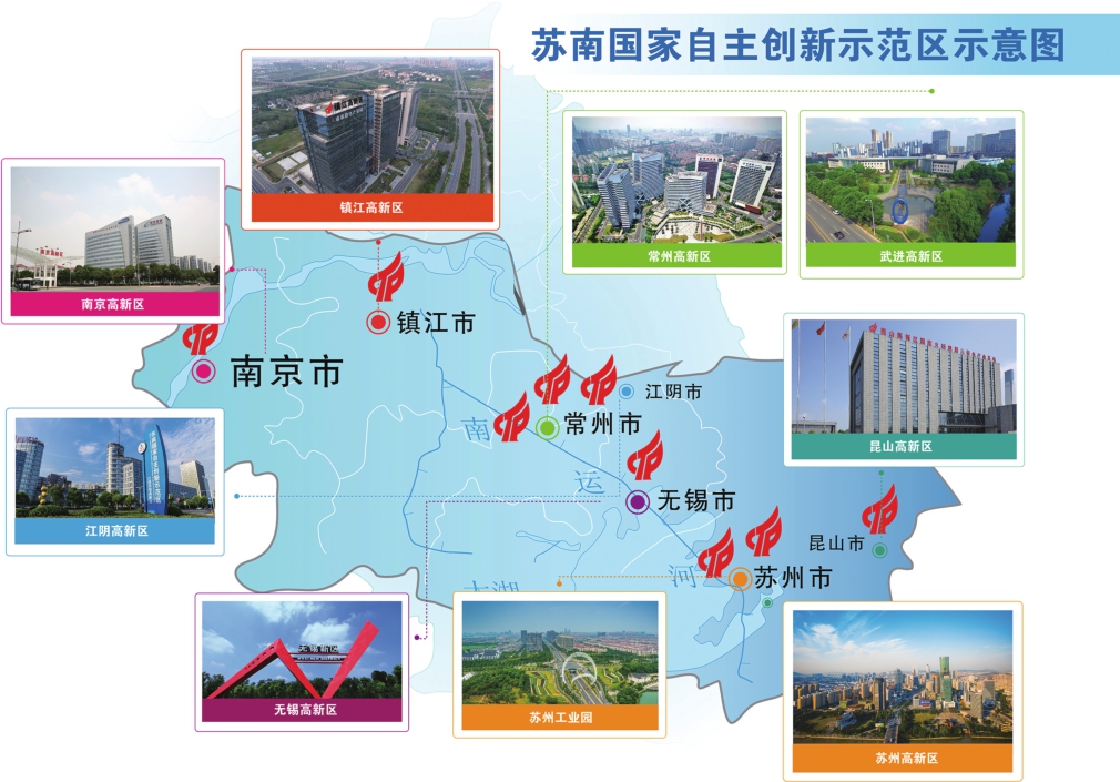 2014年10月20日,国务院正式批复,同意支持南京、苏州、无锡、常州、镇江、昆山、江阴、武进等8个高新技术产业开发区(以下简称“高新区”)和苏州工业园区建设苏南国家自主创新示范区。苏南成为继北京中关村、武汉东湖、上海张江、深圳之后的第五个国家自主创新示范区,是中国首个以城市群为基本单元的国家自主创新示范区。国家从顶层战略上要求充分发挥苏南地区科教人才优势和开发开放优势,积极开展激励创新政策先行先试,激发各类创新主体活力,加快科技成果转移转化,提升区域创新体系整体效能,努力把苏南国家自主创新示范区建设成为创新驱动发展引领区、深化科技体制改革试验区、区域创新一体化先行区和具有国际竞争力的创新型经济发展高地。苏南国家自主创新示范区的成立,既是对前期苏南模式取得巨大成效的肯定,也以新的实践探索赋予“新苏南模式”以自主创新的时代内涵。统计显示,经过四年努力,苏南自主创新示范区的自主创新能力实现大幅提升,科技体制改革取得重大突破,区域创新一体化进程进一步加快,自创区建设取得显著成效,苏南地区成为江苏转型发展的重要引擎。