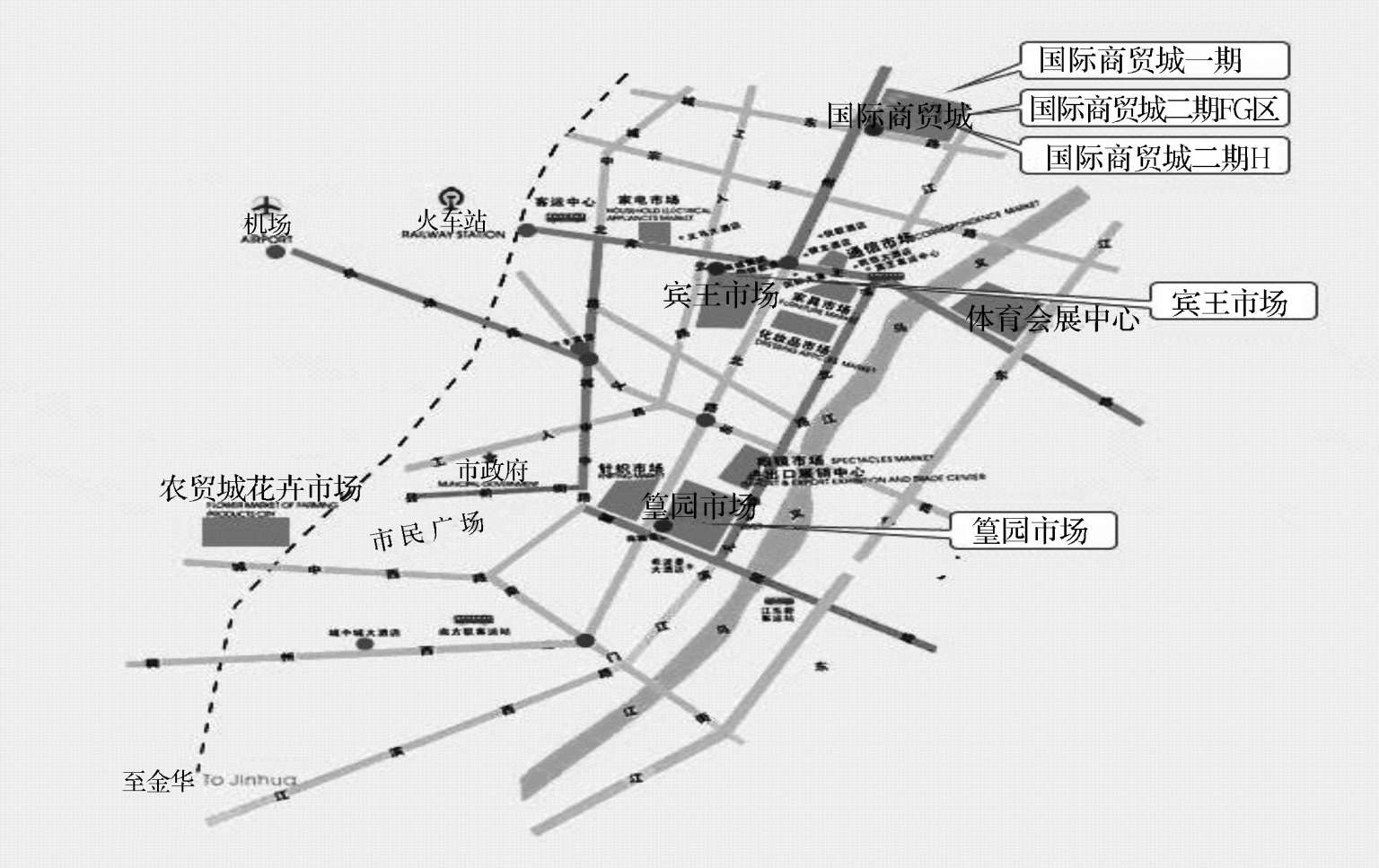 义乌国际商贸城是一个巨型的市场复合体。总体上来说,它由宾王市场、篁园市场和国际商贸城三大部分组成。
