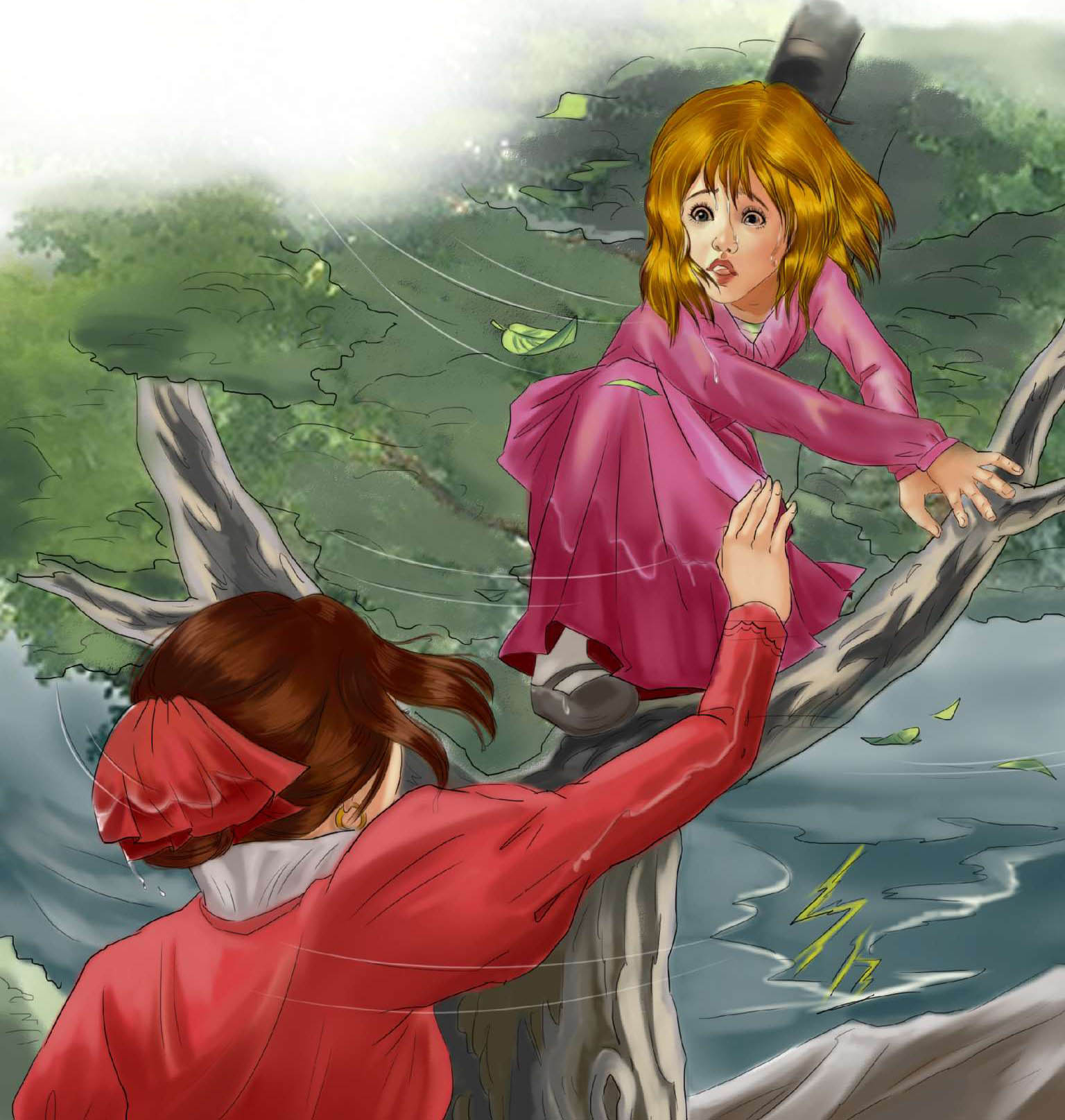 片刻的宁静后,周围的树叶大肆抖动起来,强风似乎要将大树连根拔起。我用尽所有的力气紧紧地抱住树枝,唯恐迎面而来的狂风把我吹走。树摇晃得越来越厉害了,瓢泼大雨从我的头顶浇下来,我愈发恐惧起来。