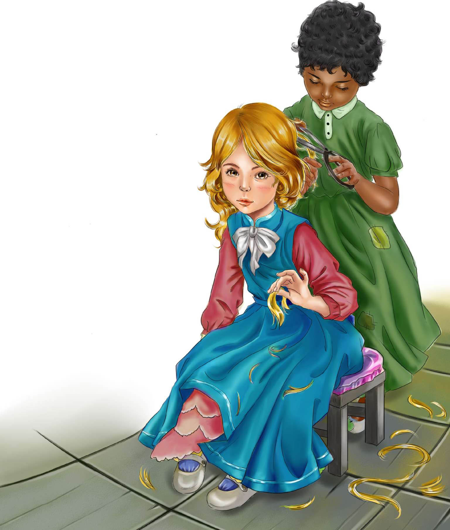 当时我们俩忙着剪纸娃娃,可是没过多久我们就厌倦了这个游戏。于是,我们俩又开始剪金银花叶子。突然,我把注意力转向了玛莎的头发。虽然一开始她极力反对我剪她的头发,但最后她还是屈服了。就这样,我拿起剪刀剪掉了玛莎的头发。玛莎觉得她应该把我的头发也剪掉,这样才公平。当时要不是母亲及时制止,她不把我的头发剪光才怪呢。