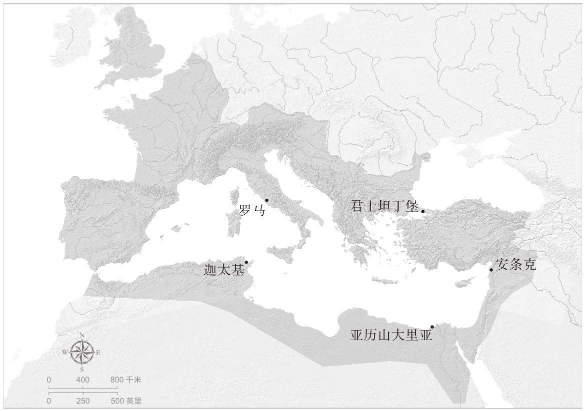 地图1 罗马帝国版图及公元4世纪时的主要城市