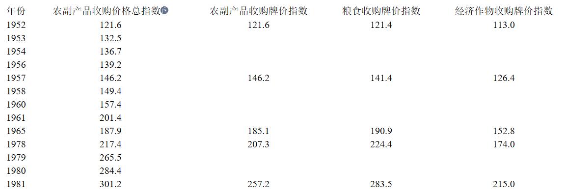 表1-2 农业部门的农产品收购牌价(以1950=100)