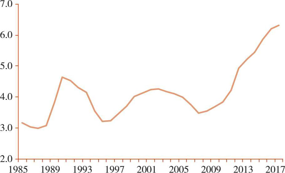 既然这个金融体系在之前几十年一直行之有效,为什么近几年“金融不支持实体经济”的矛盾变得突出了呢?我们可以根据综合的资本效率指标,即边际产出资本投入率一探究竟,它所衡量的是每生产一个新的单位的GDP所需要的新的资本投入的单位数量。从2007年到2017年,边际产出资本投入率从3.5提高到6.3(图2)。这表明金融效率确实明显下降了,同样单位的资金投入,产出的回报少了许多。所以说, “金融不支持实体经济”的抱怨是有道理的。