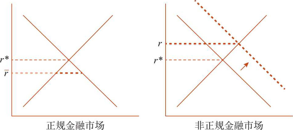 ),这个市场会出现贷款需求过度、供给不足的问题。如果银行要做信贷配给,肯定会首先将民营企业排除到正规金融市场之外,因为从银行的角度出发,这些缺乏历史数据、抵押资产和政府担保的民营企业的风险更高一些。无法从银行获得贷款的民营企业只好到非正规金融市场去寻找融资,这样就推高了非正规金融的融资利率(图3,右图中利率从