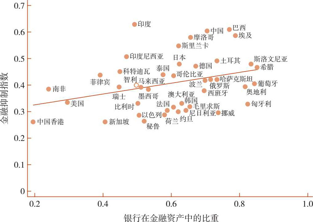 与世界各经济体的金融体系相比,中国的金融体系具有两个非常突出的特点:一是银行在金融总资产中的占比非常高;二是金融抑制的程度非常高。“金融抑制”最初是由斯坦福大学麦金农教授提出的,主要是指政府部门对金融体系的政策性干预。我们根据世界银行的基础数据构建了一套金融抑制指数,反映各经济体政府部门对金融体系干预的程度,数值的区间为从0到1。0表示完全市场化,1表示全部由政府控制,数值越大,干预的程度越高。图1中,纵轴是金融抑制指数,横轴反映银行在金融资产中的比重。