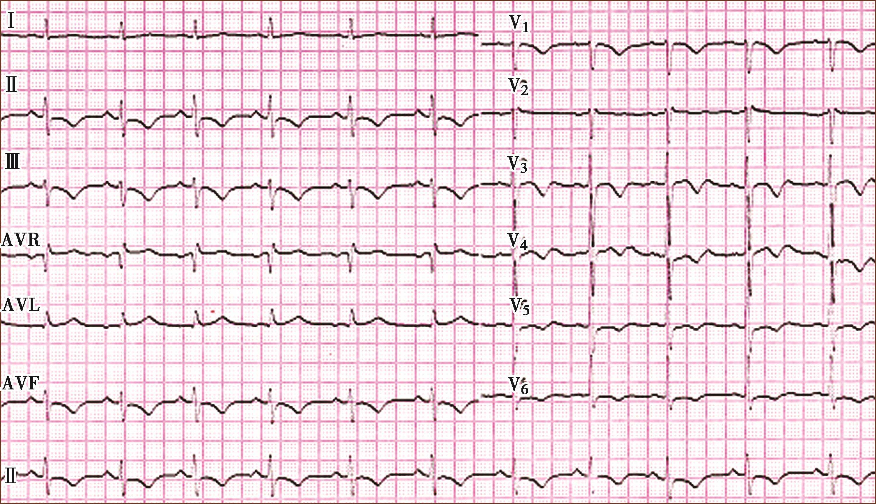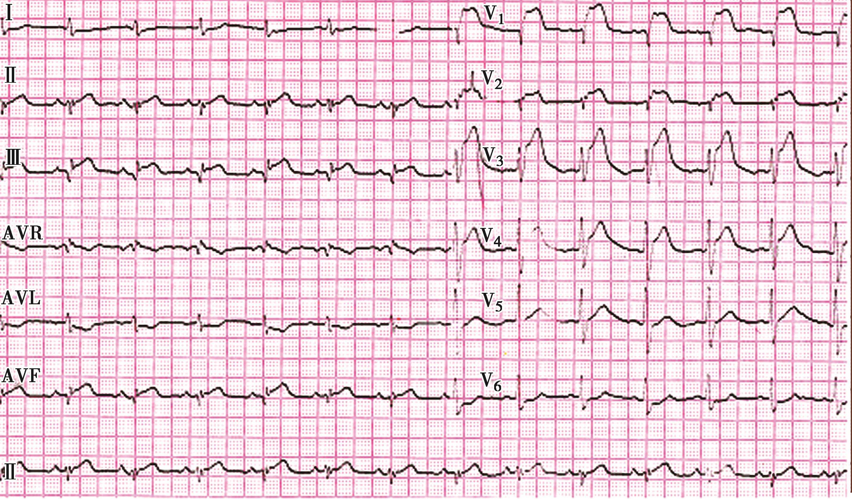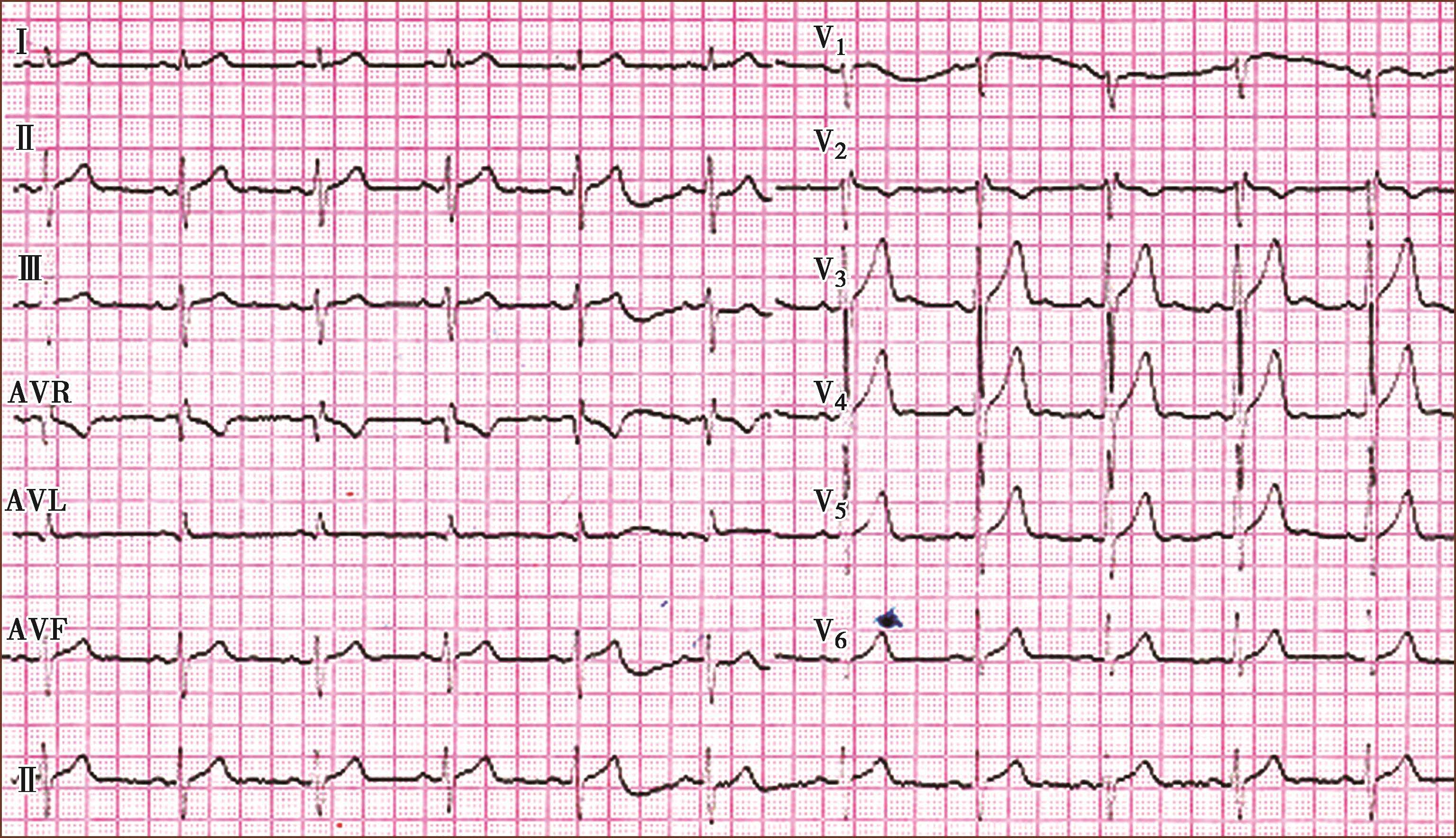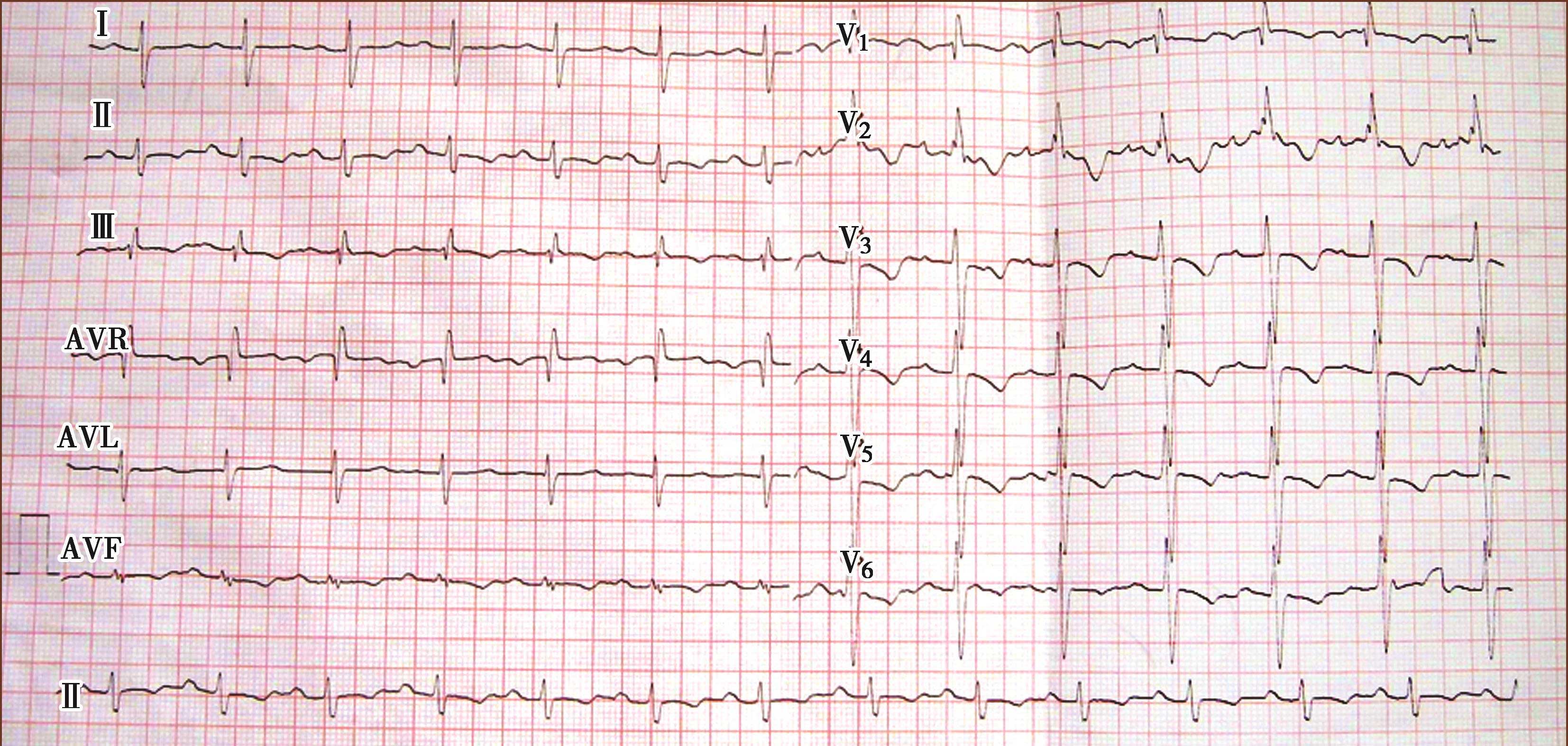 患者,男,42岁。左下肢胀痛2个月余,活动后心悸20余天,于2004年3月22日入院。患者左下肢胀痛2个月余,当地诊断左下肢深静脉血栓形成。20余天前患者活动量较大时感心悸不适。遂就诊我院急诊,肺血管CT诊断肺栓塞,收入院进一步诊治。发病以来饮食睡眠可,大小便无异常。入院后4天(2004年3月26日),7:20AM去厕所大便用力后突然倒地,立即给予胸外心脏按压,2分钟后神志心搏恢复,呼吸32次/分,口唇发绀,心率141次/分,血压测不到。给予多巴胺静推,多巴胺、肾上腺素静脉泵入。给予rt-PA 100mg静脉溶栓治疗。患者气促很快缓解,呼吸22次/分,血压95/65mmHg。心电图抬高ST段很快回到等电位线。1周后冠状动脉造影正常。入院时心电图(见图5-3-1):窦性心律,大致正常。入院4天倒地时心电图(图5-3-2):Ⅱ、Ⅲ、AVF、V 1 ~V 3 弓背向上抬高0.1~0.4mV。溶栓后心电图(图5-3-3):抬高ST段很快回到等电位线,Ⅱ、Ⅲ、AVF、V 1 ~V 6 T波倒置。动脉血气分析(意识丧失时):pH 7.41,PO 2 40.2mmHg,PCO 2 33.7mmHg。动脉血气分析(血压恢复时):pH 7.44,PO 2 119mmHg,PCO 2 37.9mmHg(吸氧状态下)。肺血管CT:双侧多发肺栓塞。肺灌注:双侧多发肺段充盈缺损。床旁超声(2004年3月26日,抢救时):左心室舒张末期前后径35mm,右心室前后径36mm,右心扩大,三尖瓣少-中量反流,肺动脉高压(中度),64mmHg。