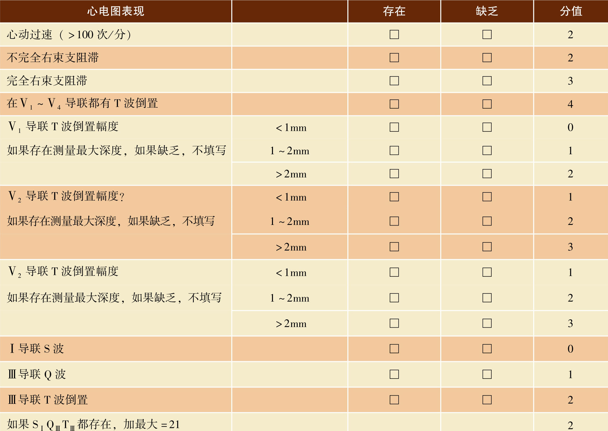 急性肺栓塞在心电图上表现为各种各样的非特异性变化,很难做到排除或确诊急性肺栓塞。2001年Daniel等认为,急性肺栓塞可以通过简单的心电图评分(Dianel评分,表5-1-1)进行可能性快速评估。对于怀疑急性肺栓塞的急诊患者,较高的心电图评分是非常有意义的,同时结合相关临床表现更有利于急性肺栓塞的诊断。结果显示心电图分值与急性PTE患者肺动脉收缩压(SPAP)和平均肺动脉压呈显著正相关,而与非PTE所致肺动脉高压无相关性;心电图分值≥10可预测重度肺动脉高压(SPAP>50mmHg),提示急性PTE所致肺动脉压力和右心负荷增加后对于心脏传导和复极的影响要大于其他原因所致的肺动脉高压。Iles等报道Daniel心电图分值≥3时预测PPDS>50%的敏感度为70%,特异度为59%,心电图分值≥6时则其敏感度和特异度分别为40%和90%。Iles等采用Daniel心电图评分系统对急性肺栓塞引起的灌注缺损严重程度进行评价,该研究说明,心电图评分可反映肺血管系统的堵塞程度。Yoshinaga等研究也表明,平均肺动脉压与心电图异常数目呈正相关。急性肺栓塞患者心电图异常数目可以用来评估急性肺栓塞的严重性。急性肺栓塞大面积组(PPDS>50%)心动过速,不完全右束支传导阻滞,Ⅴ 1 ~Ⅴ 4 、Ⅴ 2 、Ⅴ 3 T波倒置,ⅢT波倒置,ⅢQ波>1.5mm及S Ⅰ Q Ⅲ T Ⅲ 例数明显多于小面积组,表明心电图异常对急性PTE的早期拟诊和严重程度评估均是有益的。心电图评分对患者发病早期病情危重程度的判定有重要的参考价值,即评分愈高,右心功能愈差,呼吸功能紊乱愈重,病情往往愈危重。心电图评分≥6时,高度提示右心受累,同时具有较高的敏感度和特异度;当评分<6时,多提示肺循环血管阻力术H对较低。增加的右心后负荷可能尚未对右心系统构成实质性影响。右心室功能异常是非大面积PTE患者早期预后不良的关键因素。急性心功能衰竭是发病早期(住院30天)的主要死亡原因。心电图评分对于非大面积肺栓塞预后有一定的指导意义,评分高者住院30天病死率显著高于评分低者,同时前者呼吸功能的恢复时间明显长于后者,此外前者合并慢性血栓栓塞性肺动脉高压的风险明显高于后者,预后较差;而后者往往随着临床治疗的进行,肺血管床阻塞面积的缩小而逐渐好转,预后较佳。