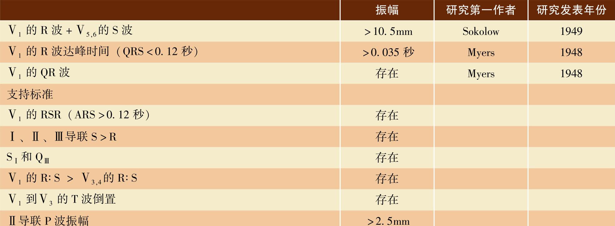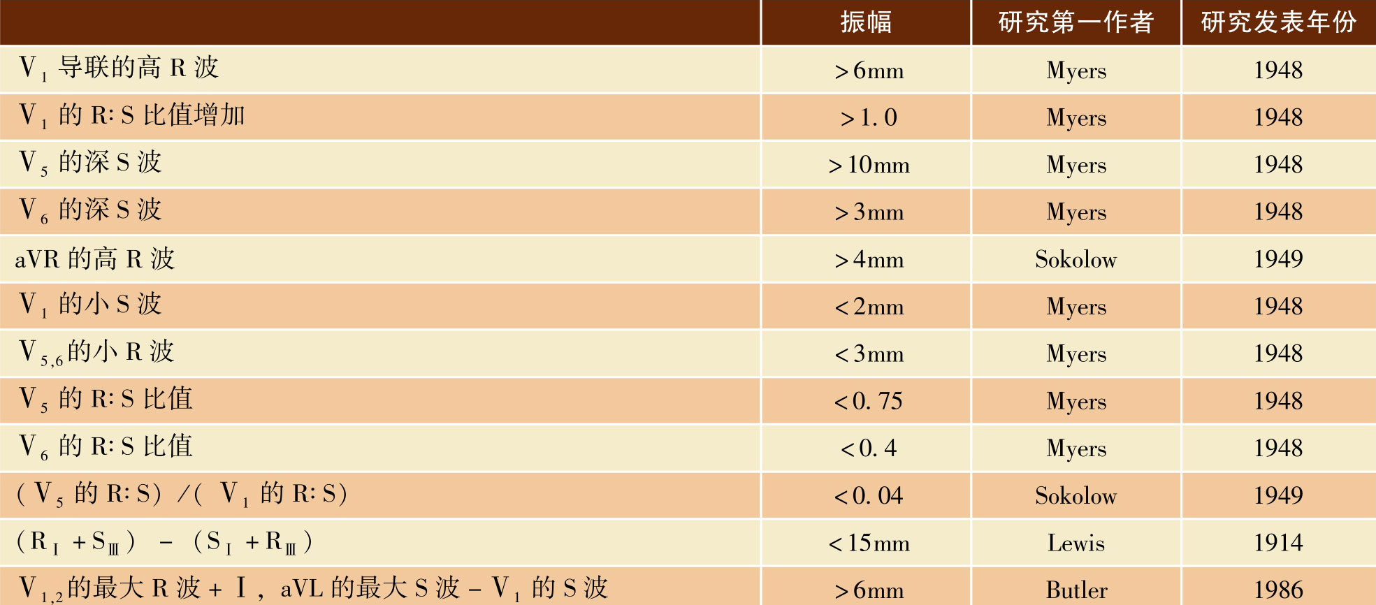 2009年AHA/ACCF/HRS《心电图标准化与解析建议》(以下简称 “建议”)对于右心室肥厚提出诊断标准(表5-2-1),很多标准大多来自于Ⅰ、Ⅴ 1 、Ⅴ 6 导联的R波和S波的振幅,和Ⅴ 1 的R波达峰时间。标准很多来自于尸检数据,一些是临床和血流动力学确诊为右心室负荷增加。心脏超声也被作为参考标准,但是与左心室肥厚相比,要相对不很准确。右心室的三维结构复杂,右心室游离壁的厚度经常难以准确测量。