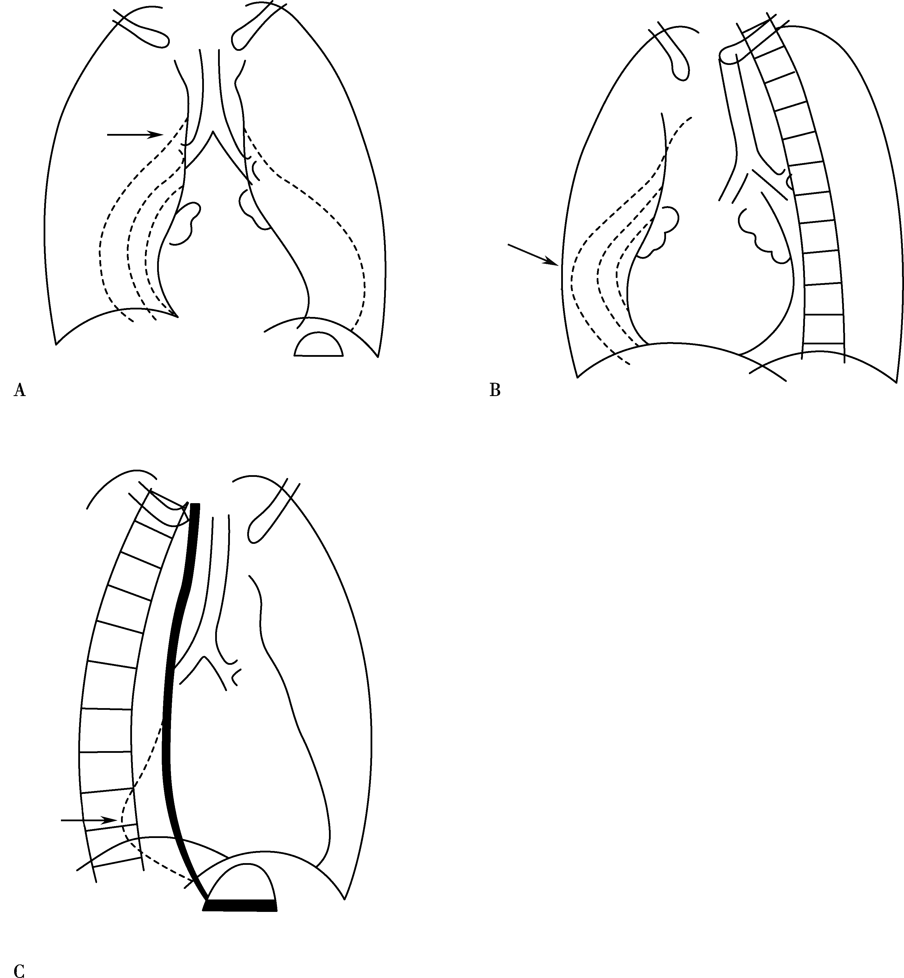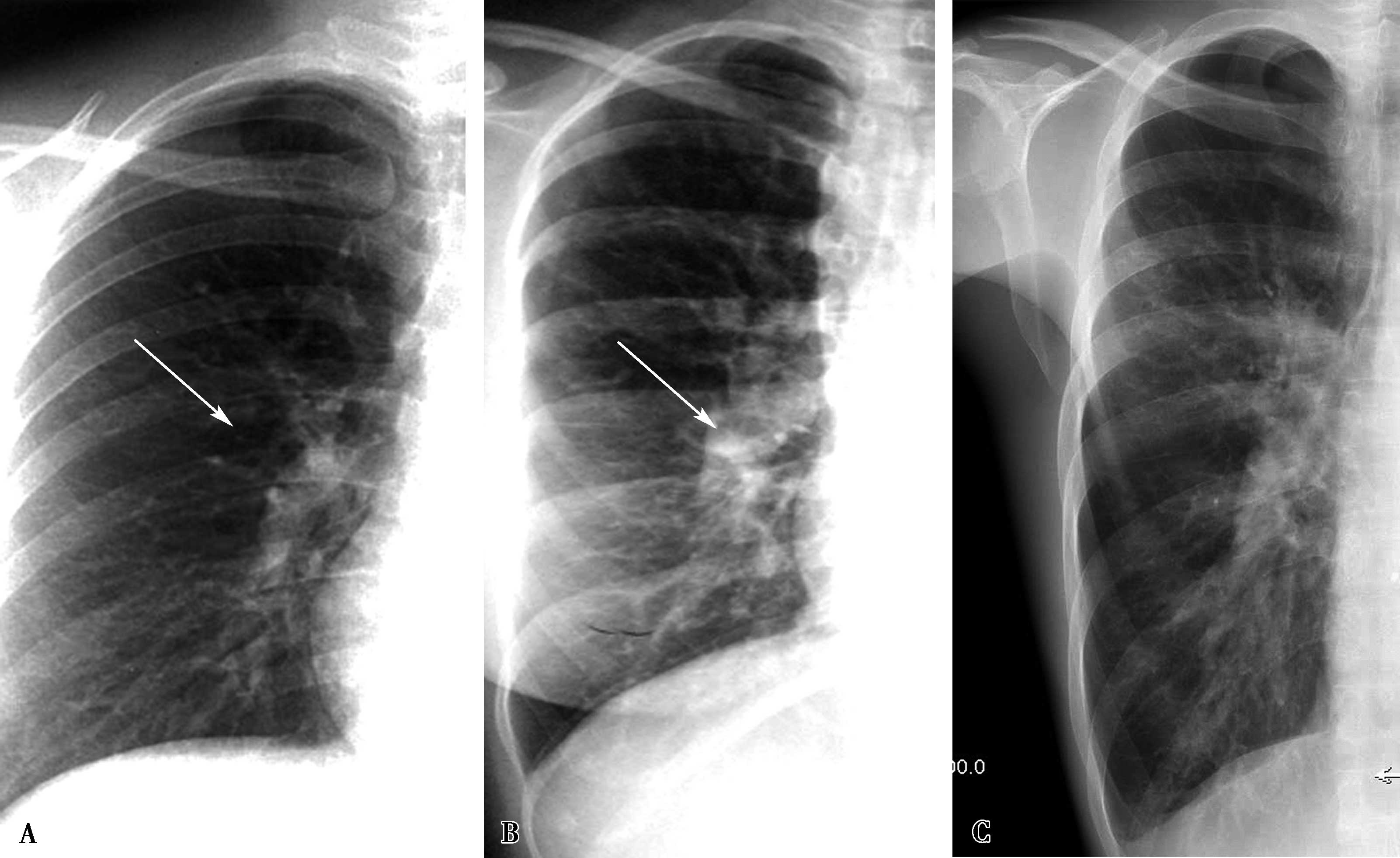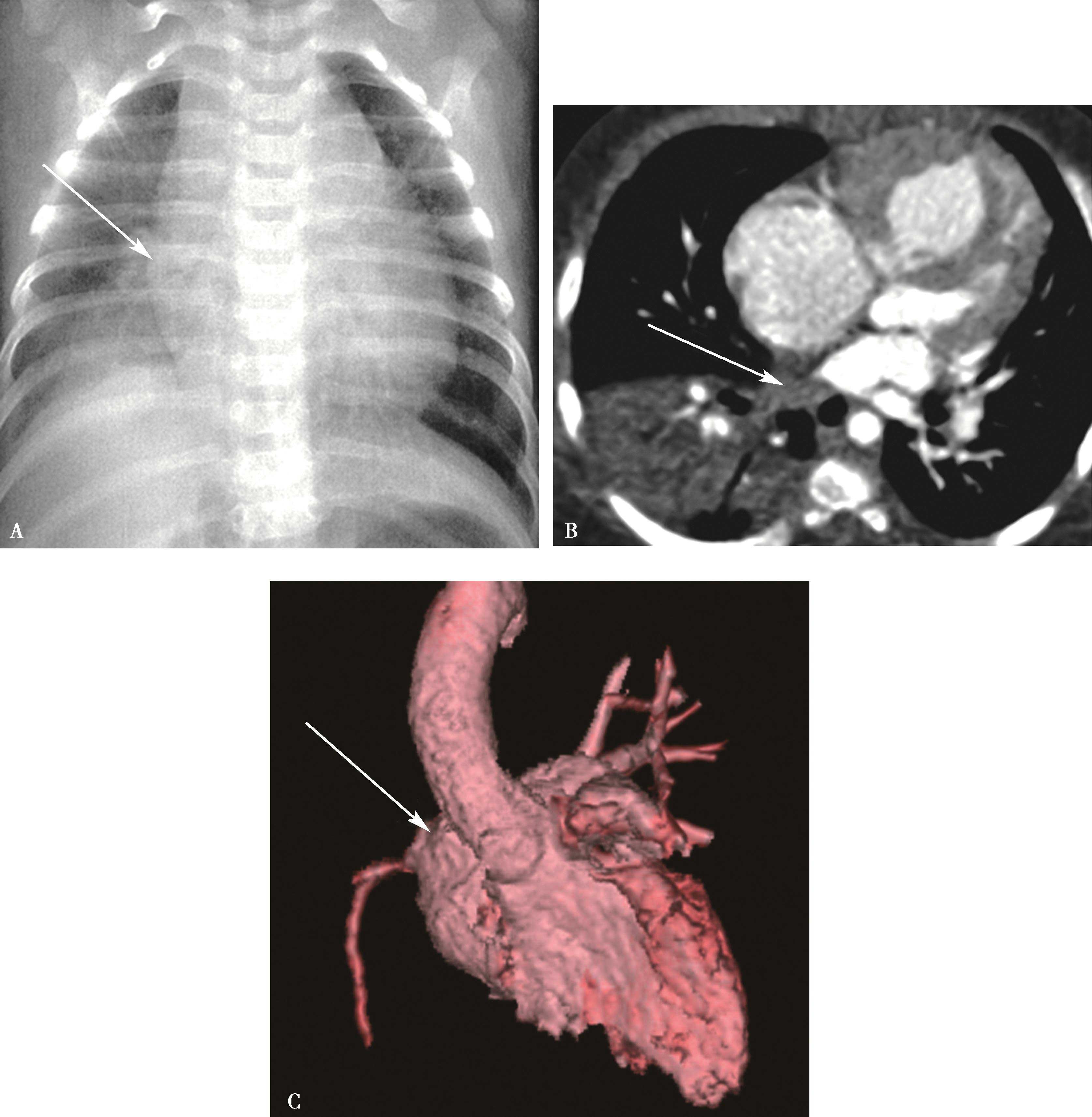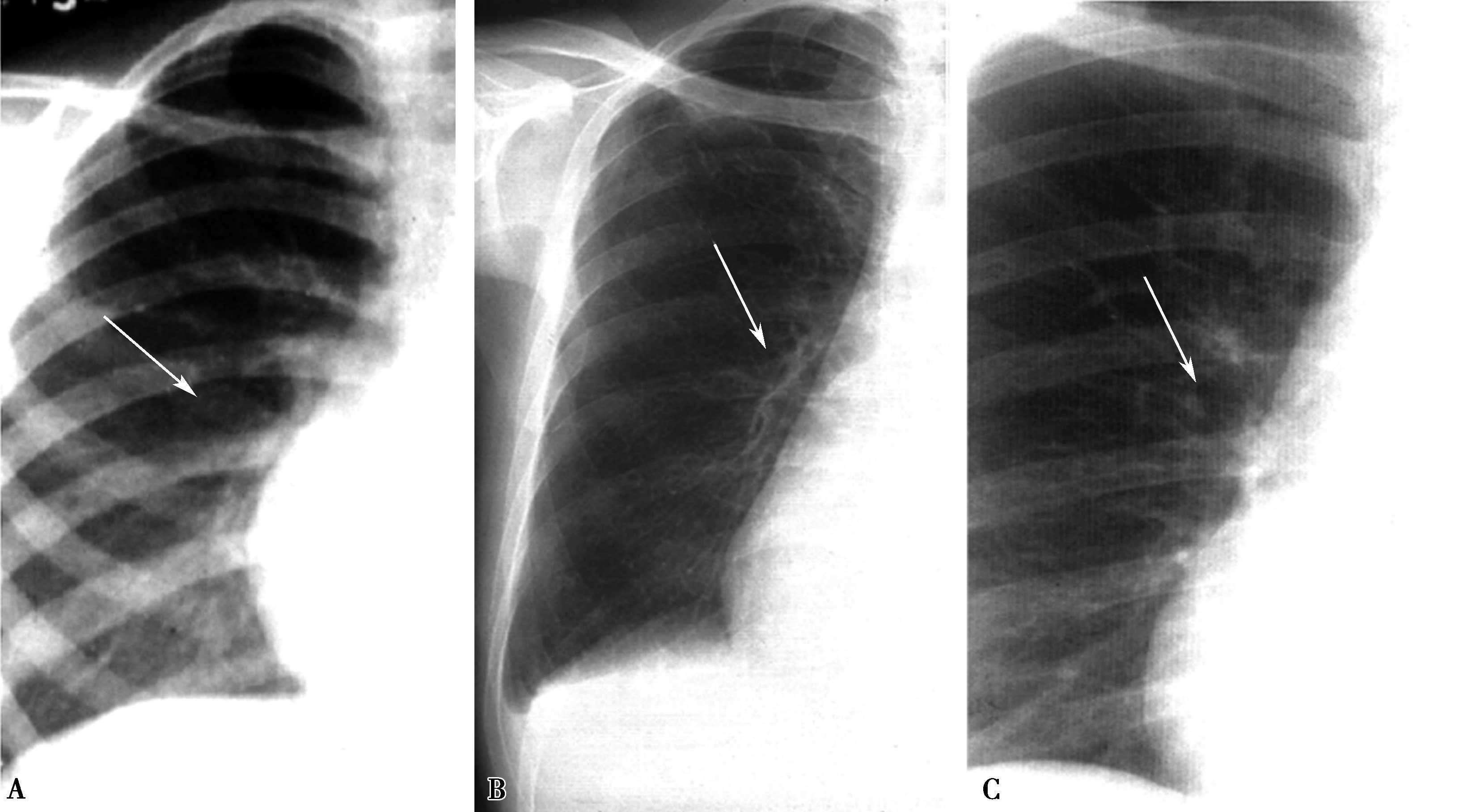 A.轻度肺血减少(右下肺动脉稍细↑);B.中度肺血减少(右下肺动脉中度变细↑);C.重度肺血减少(右下肺动脉明显变细,或不可见↑)