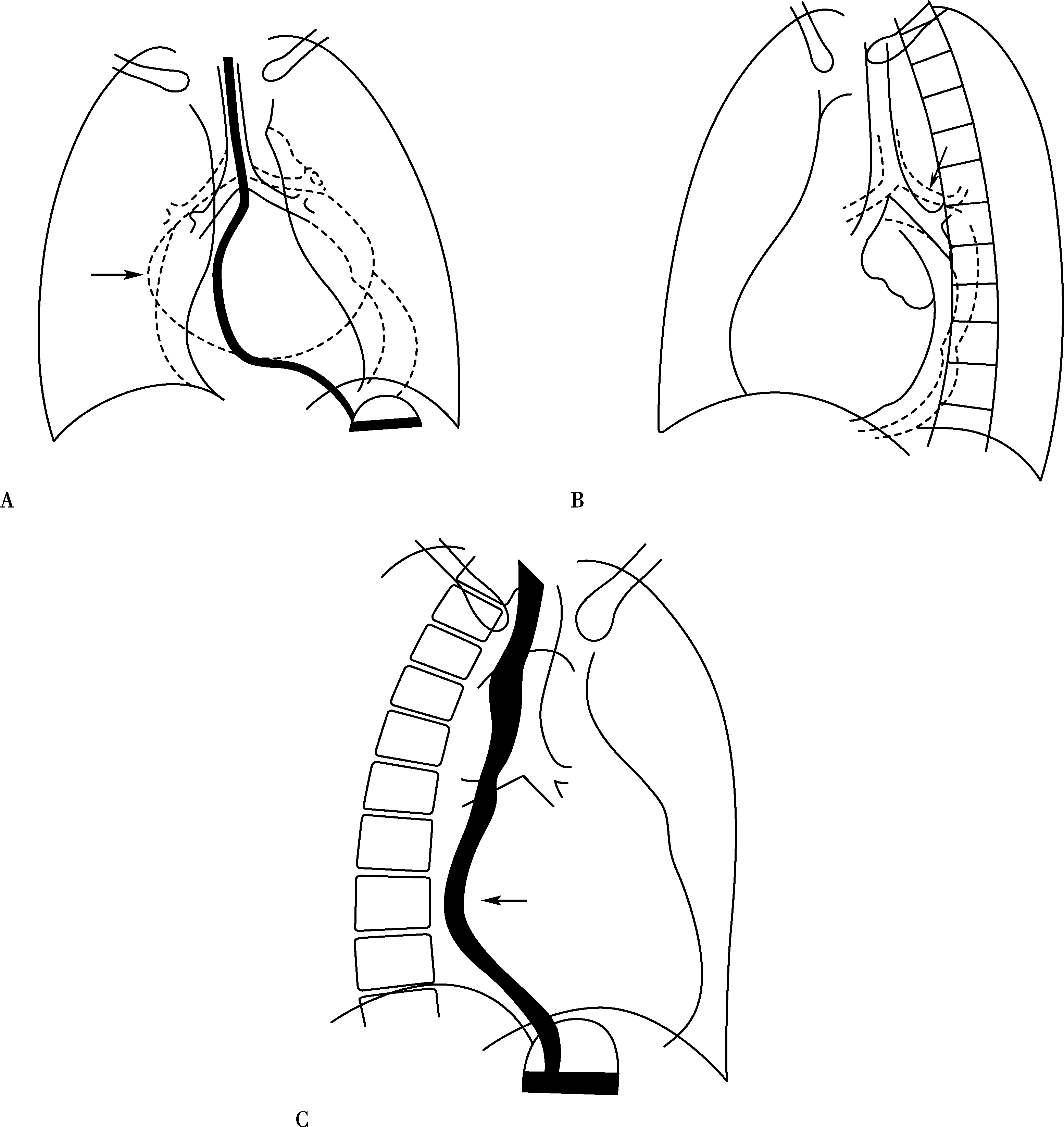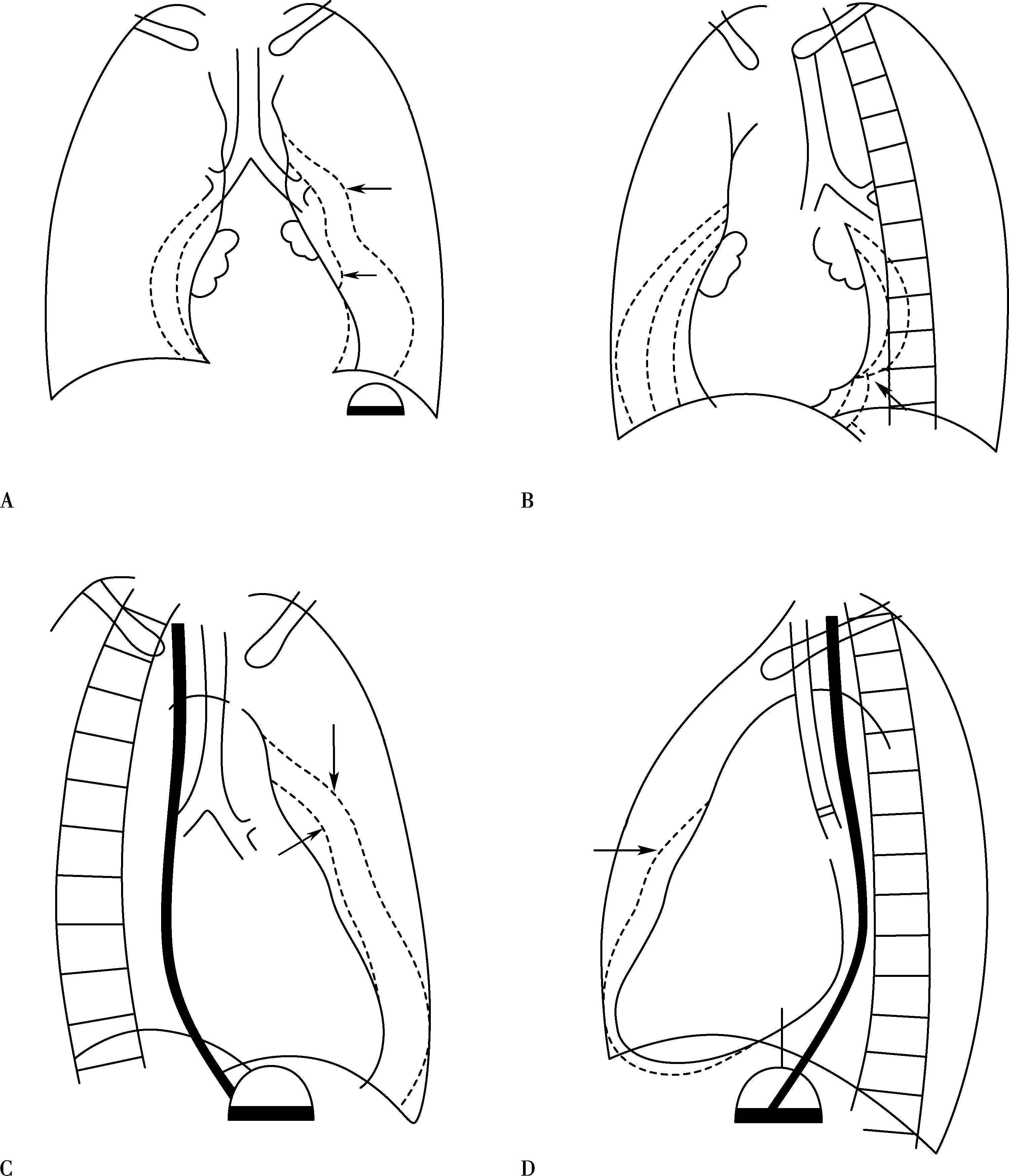心后缘向后膨隆,与服钡食管仅是重叠无推移现象(图7-1-4C↑)。