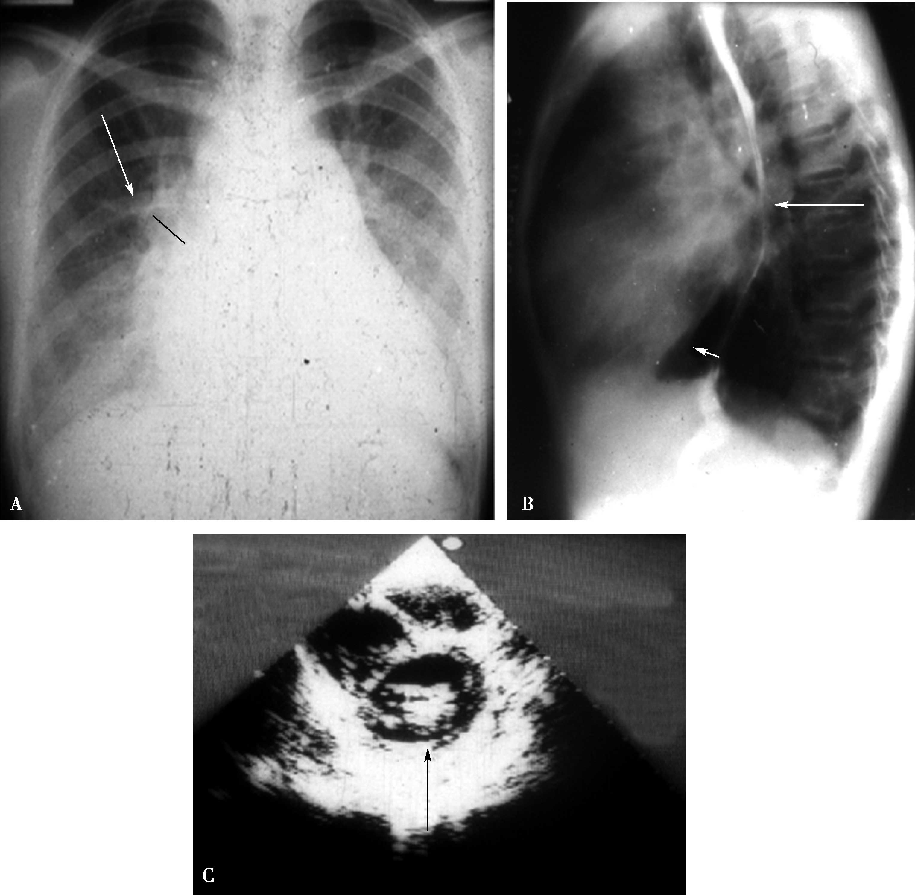 心后缘膨隆,服钡食管中段压迹,左心房增大推压食管向后移位(图7-1-2C)。