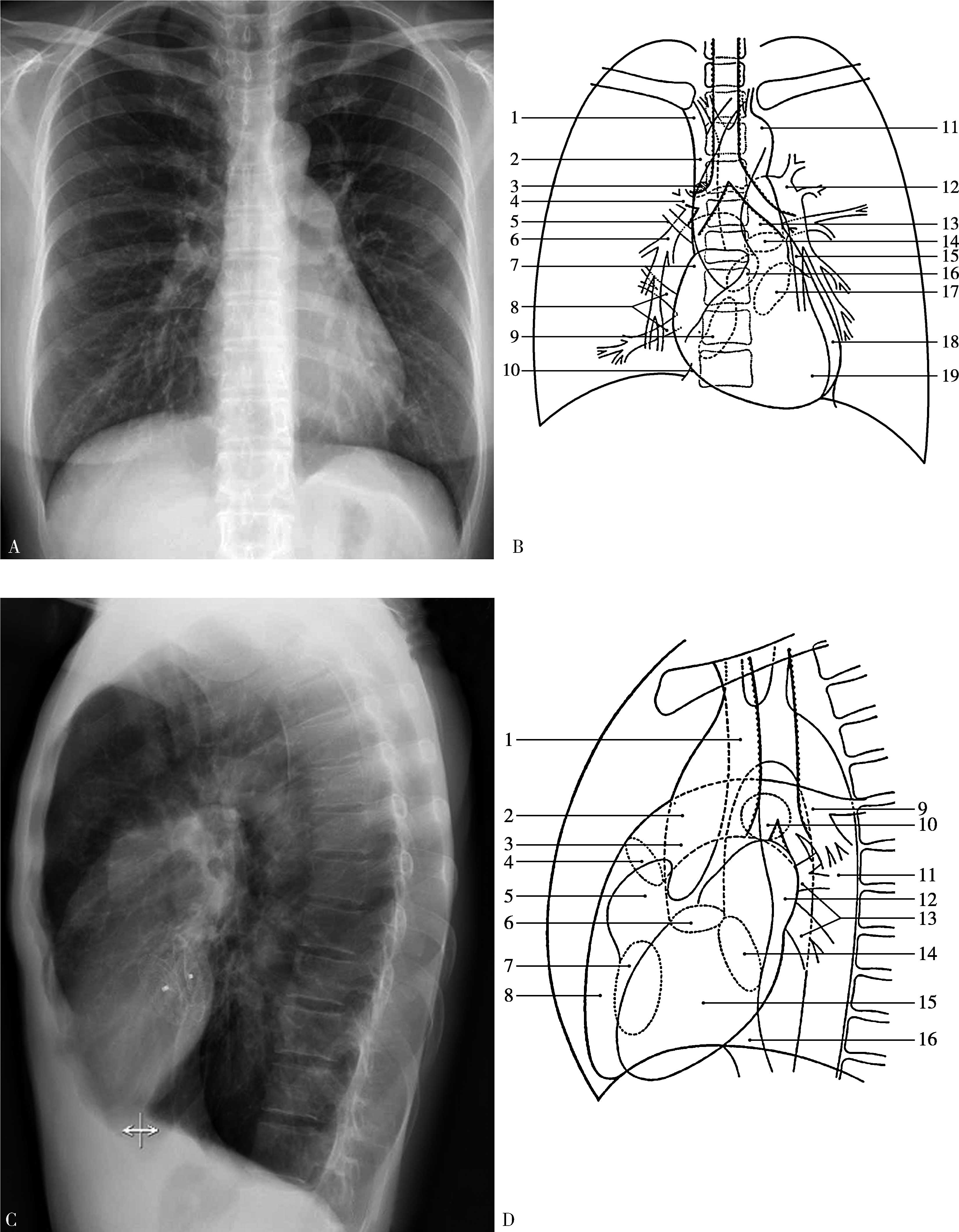 A.心脏远达X线片,B.胸部正位X线片模式图:1右无名静脉;2上腔静脉;3奇静脉;4右上肺动脉;5右上肺静脉;6右下肺动脉;7右心房;8右下肺静脉;9三尖瓣口;10下腔静脉;11主动脉弓;12左肺动脉;13主肺动脉;14肺动脉瓣口;15左心房耳部;16主动脉瓣口;17二尖瓣口;18左心室;19右心室,C.心脏左侧位X线片,D.胸部左侧位模式图:1上腔静脉;2主肺动脉;3升主动脉;4肺动脉瓣口;5右心房耳部;6主动脉瓣口;7三尖瓣口;8右心室;9左肺动脉;10右肺动脉;11降主动脉;12左心房;13肺静脉;14二尖瓣口;15左心室;16下腔静脉