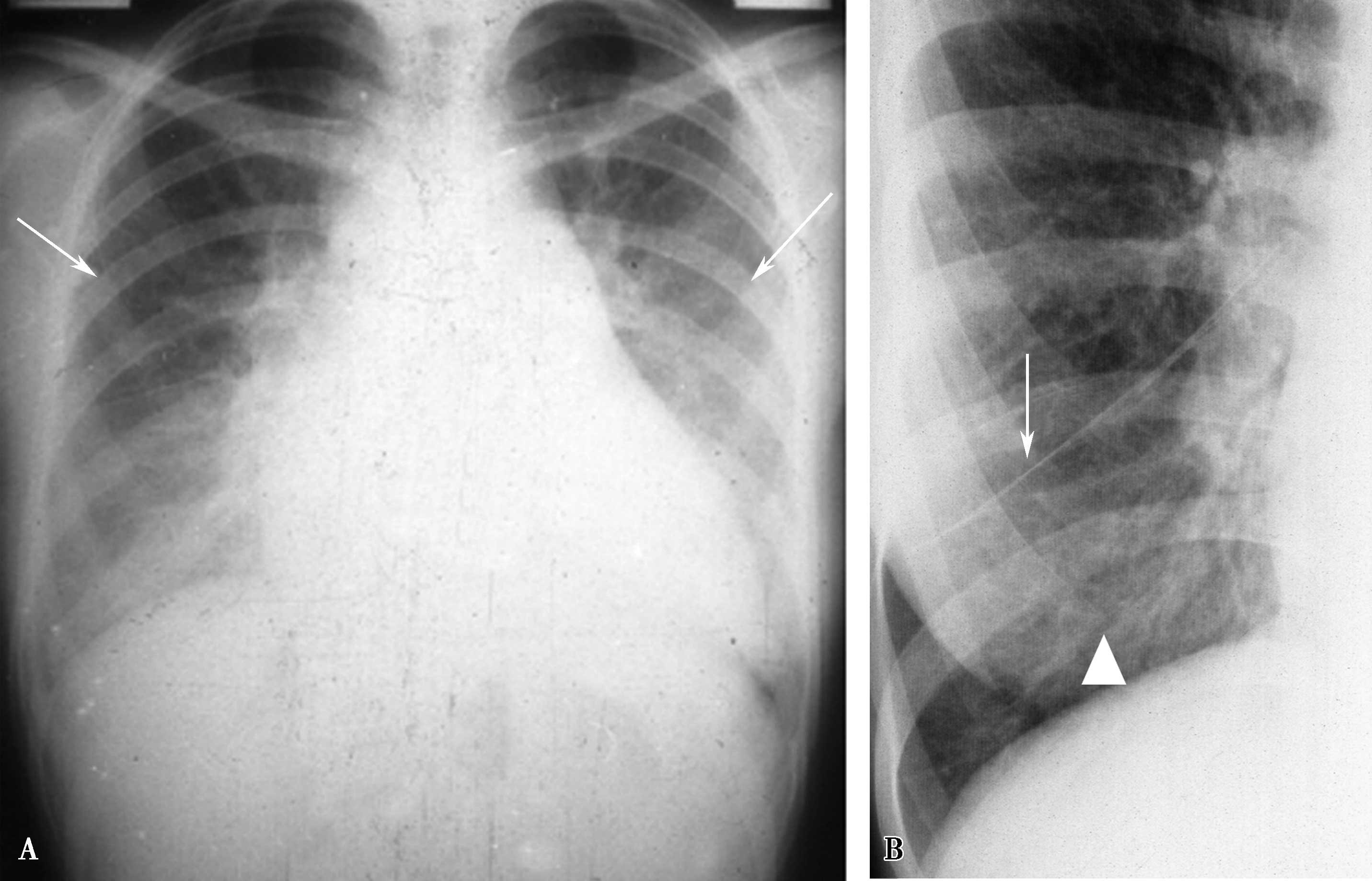 图7-2-11 男,38岁,慢性肺栓塞5年,超声测肺动脉压110mmHg。A.胸部正位两肺纹理分布不均,两下肺纹理稀少,右下肺动脉增宽呈截断现象,上肺动脉迂曲增宽;肺动脉段高度凸出(↑),右心房室增大;B.左侧位心前间隙缩小,肺动脉圆锥扩张(↑)。X线胸片诊断:慢性血栓栓塞性肺动脉高压