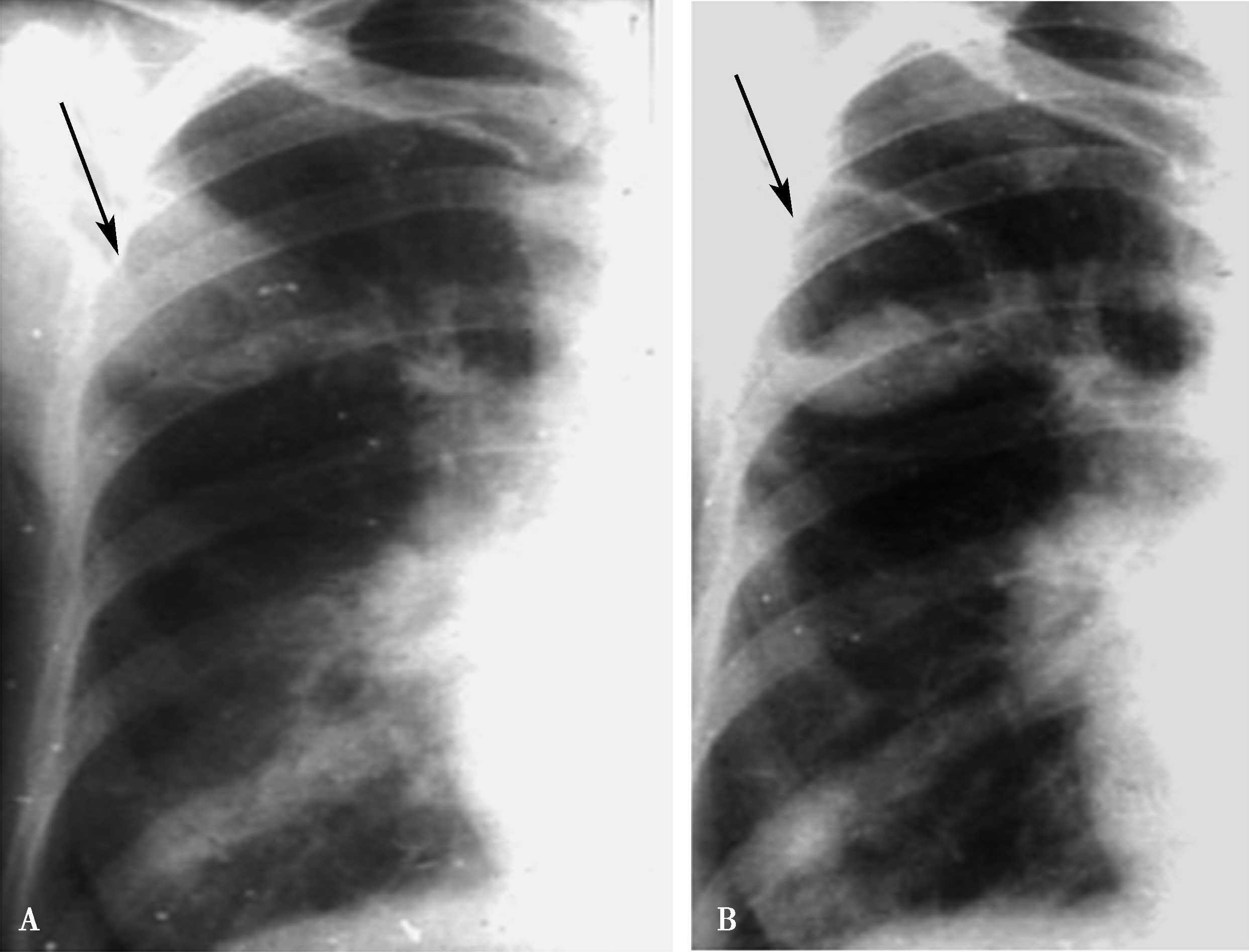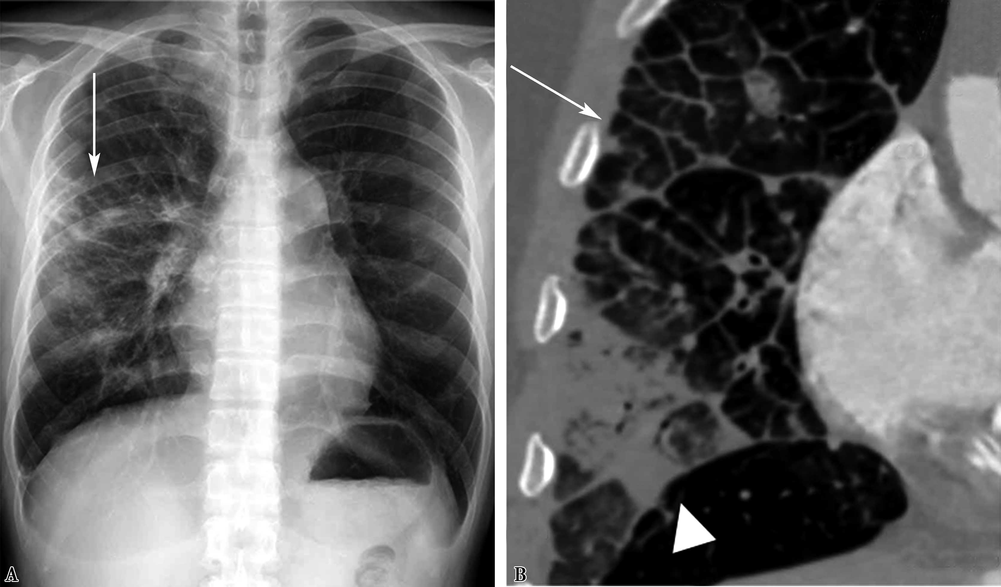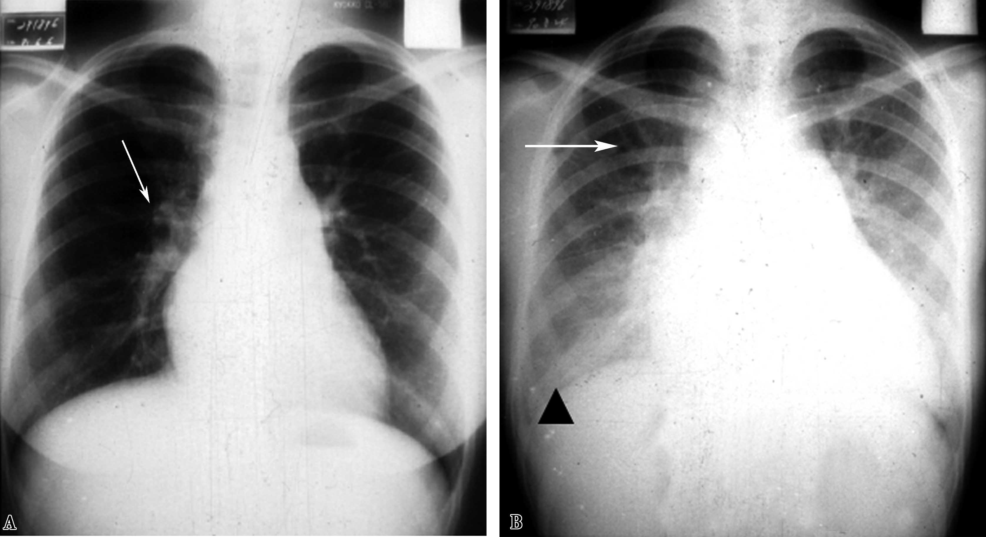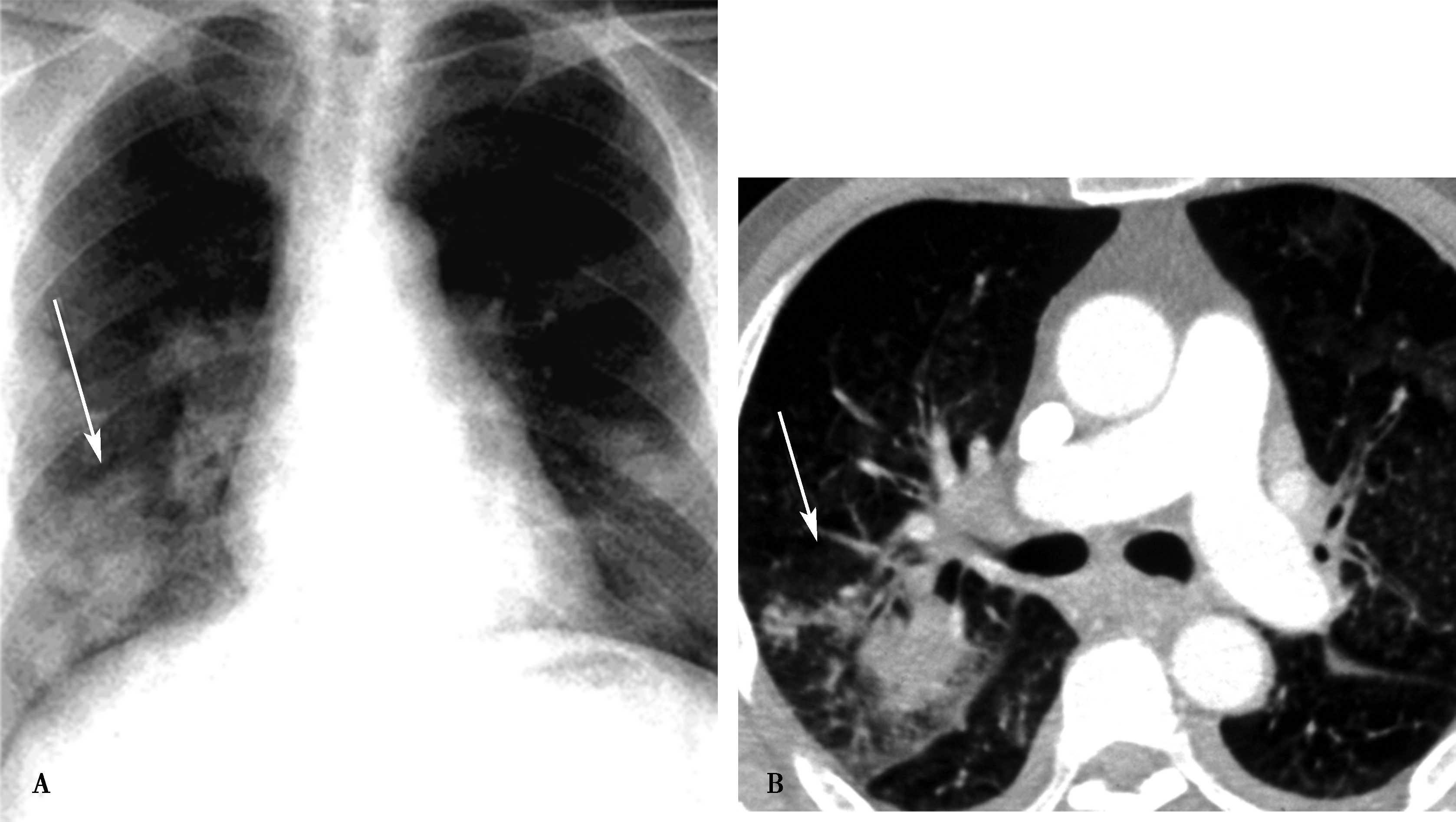 A.右上肺三角形实变阴影,靠近肺野外围,尖端朝向肺门,为肺梗死(↑);B.两周后三角形实变区空腔形成;为梗死灶当与支气管交通时,坏死物排出空气进入而形成空腔(↑)