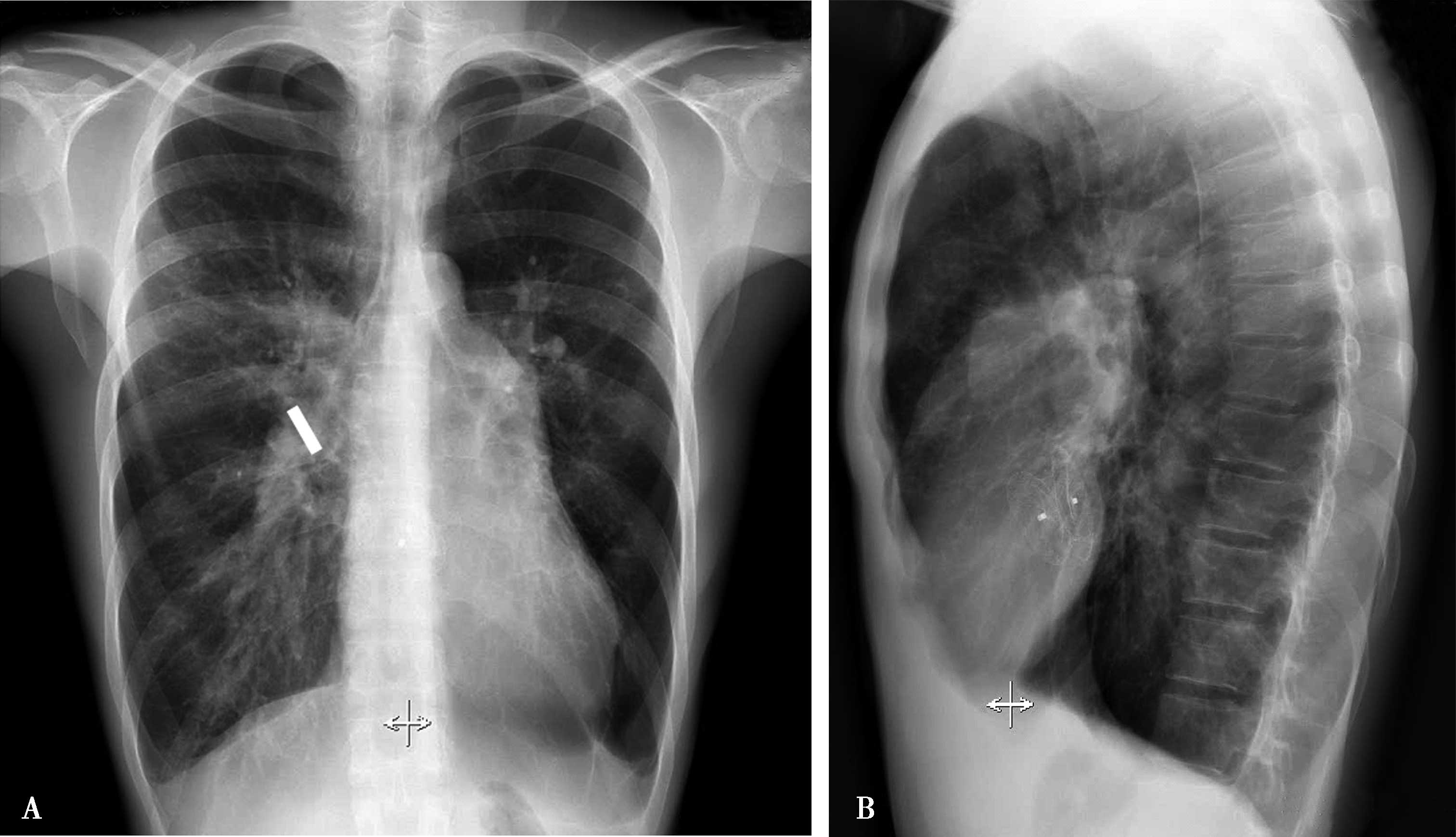 图7-2-10 胸部X线片。A.正位;B.左侧位。桶状胸(横径及前后径增大),侧位胸骨后心前间隙增大(侧位片),横膈位低平。两肺透过度增高,外围肺纹理少,两肺门动脉增宽,右下肺动脉宽20mm;肺动脉段轻度膨凸。胸主动脉迂曲扩张,肺动脉圆锥膨隆(B↑),右心室肥厚,心胸比率<0.5。X线胸片诊断:肺气肿(COPD),肺动脉高压,肺心病