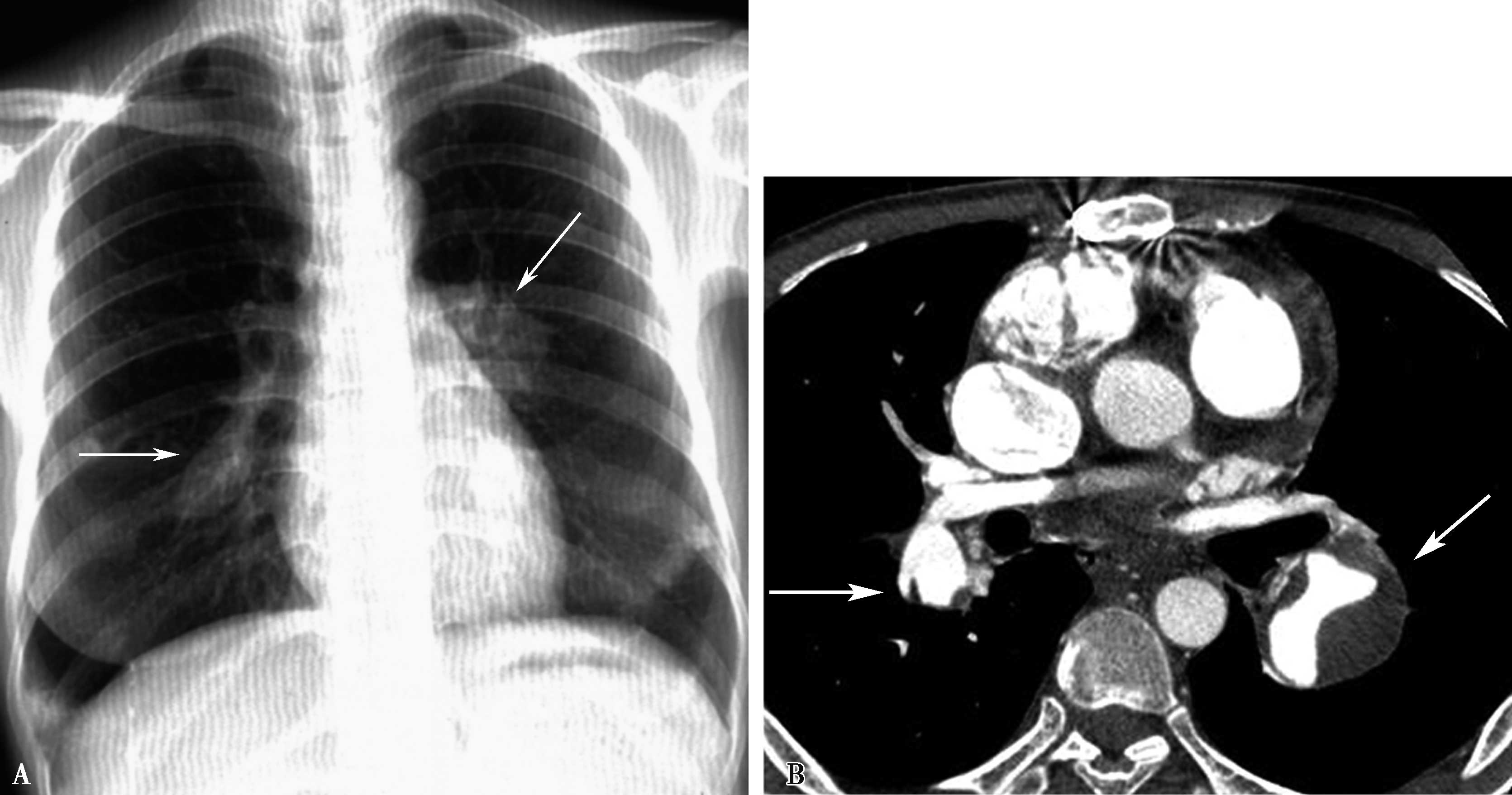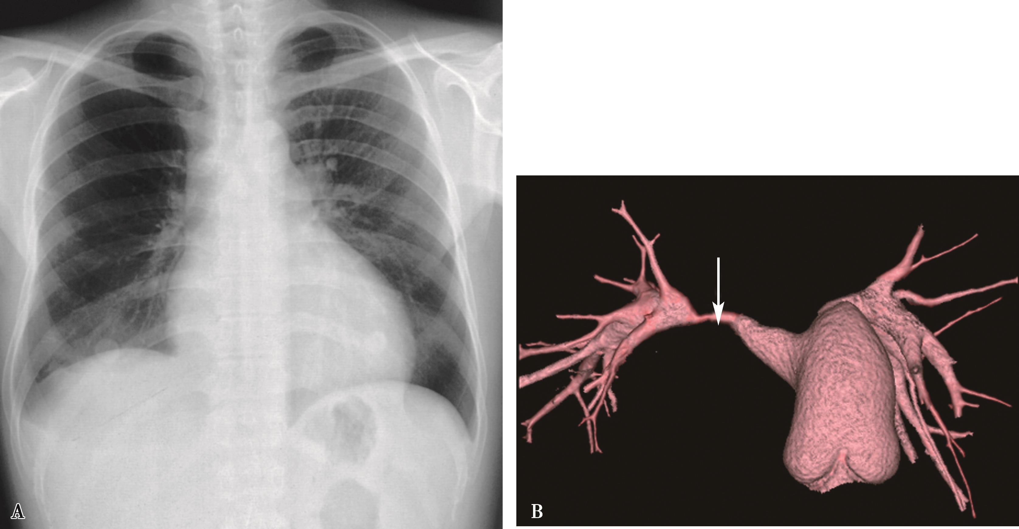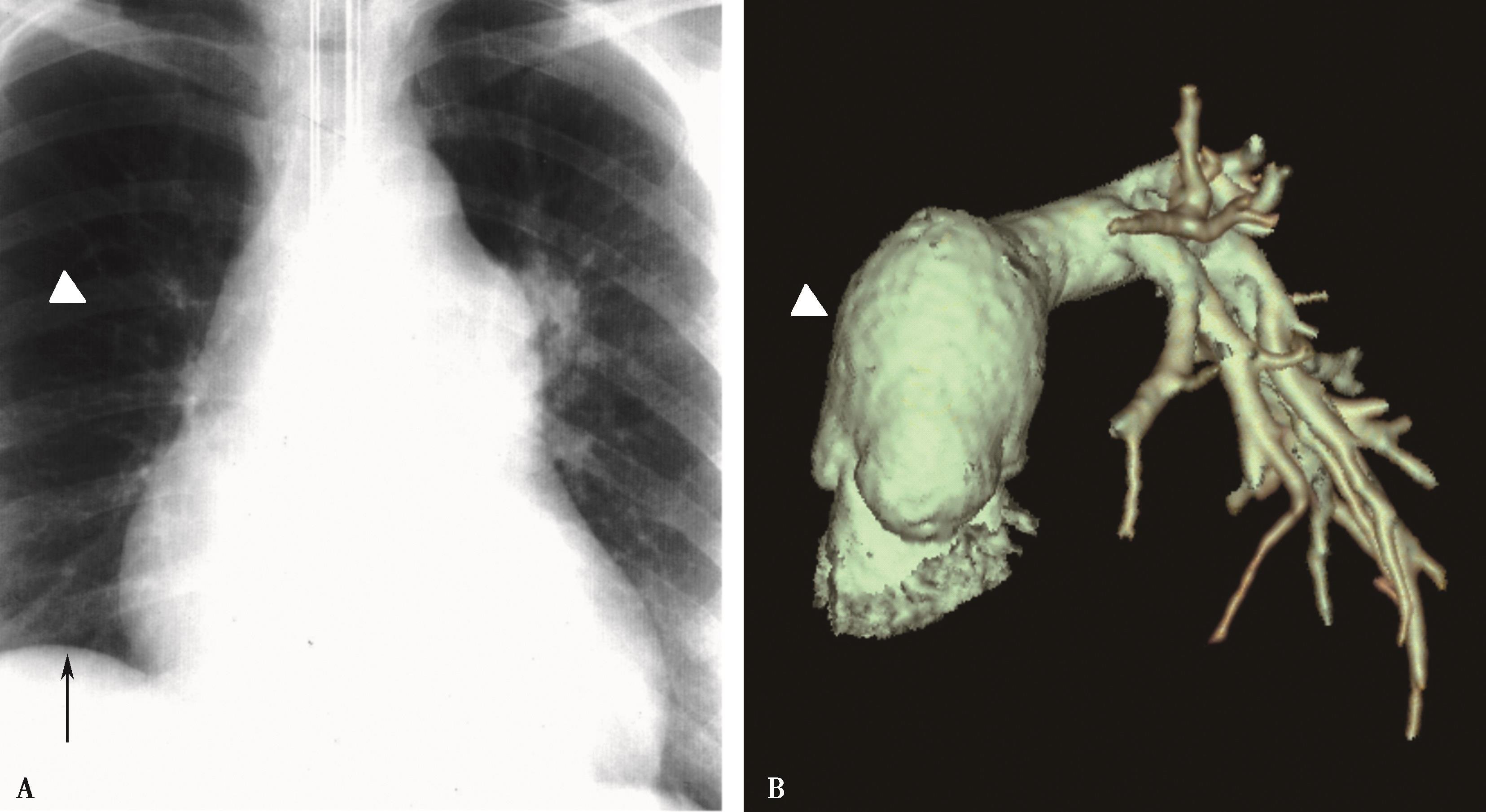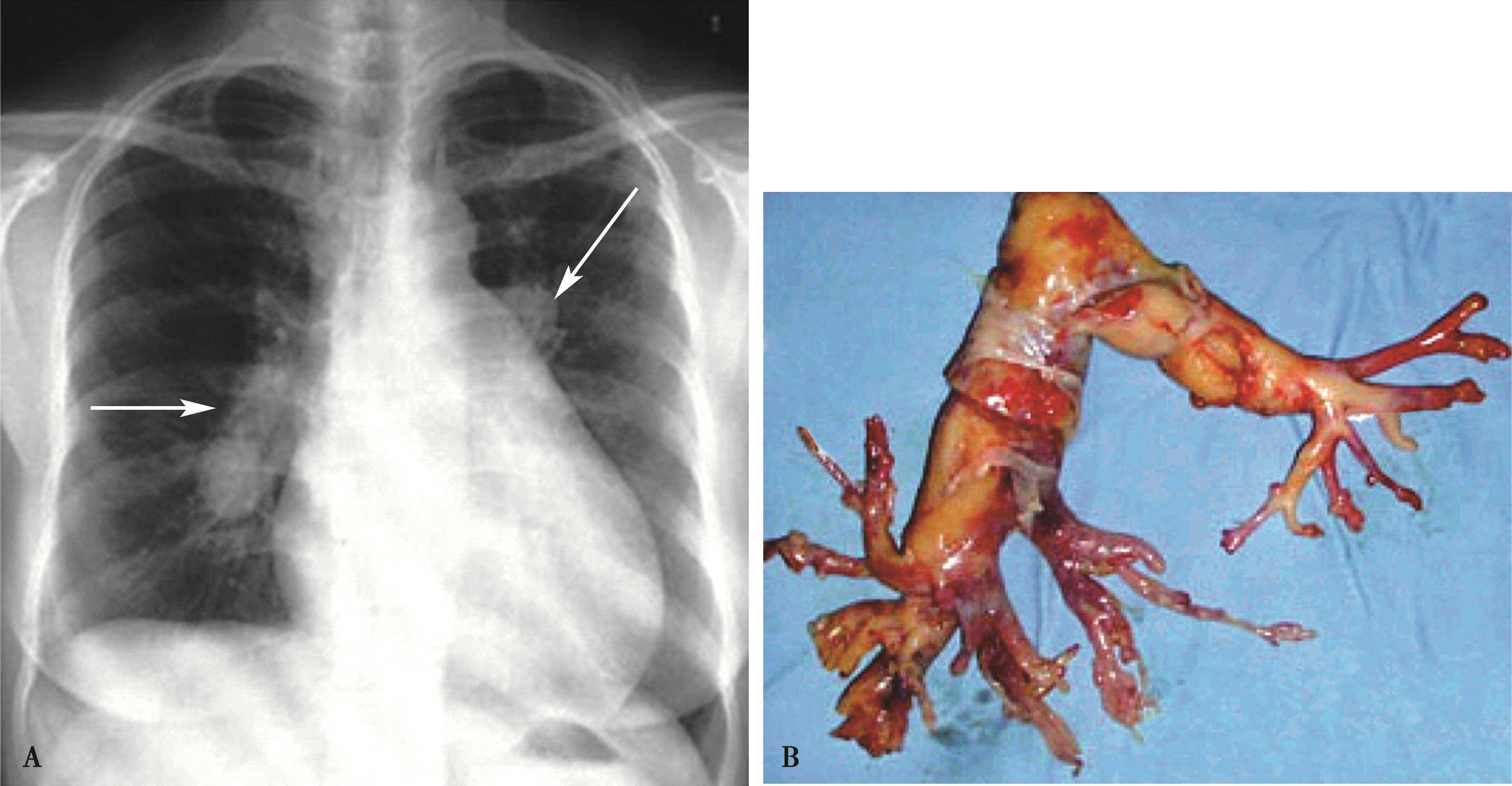 图7-2-19 男,38岁,白塞病,A.胸部X线片示,右下肺动脉瘤样扩张,左肺动脉瘤样扩张(↑);B.肺动脉CTA显示右下肺动脉、左下肺动脉瘤,合并血栓形成(↑)