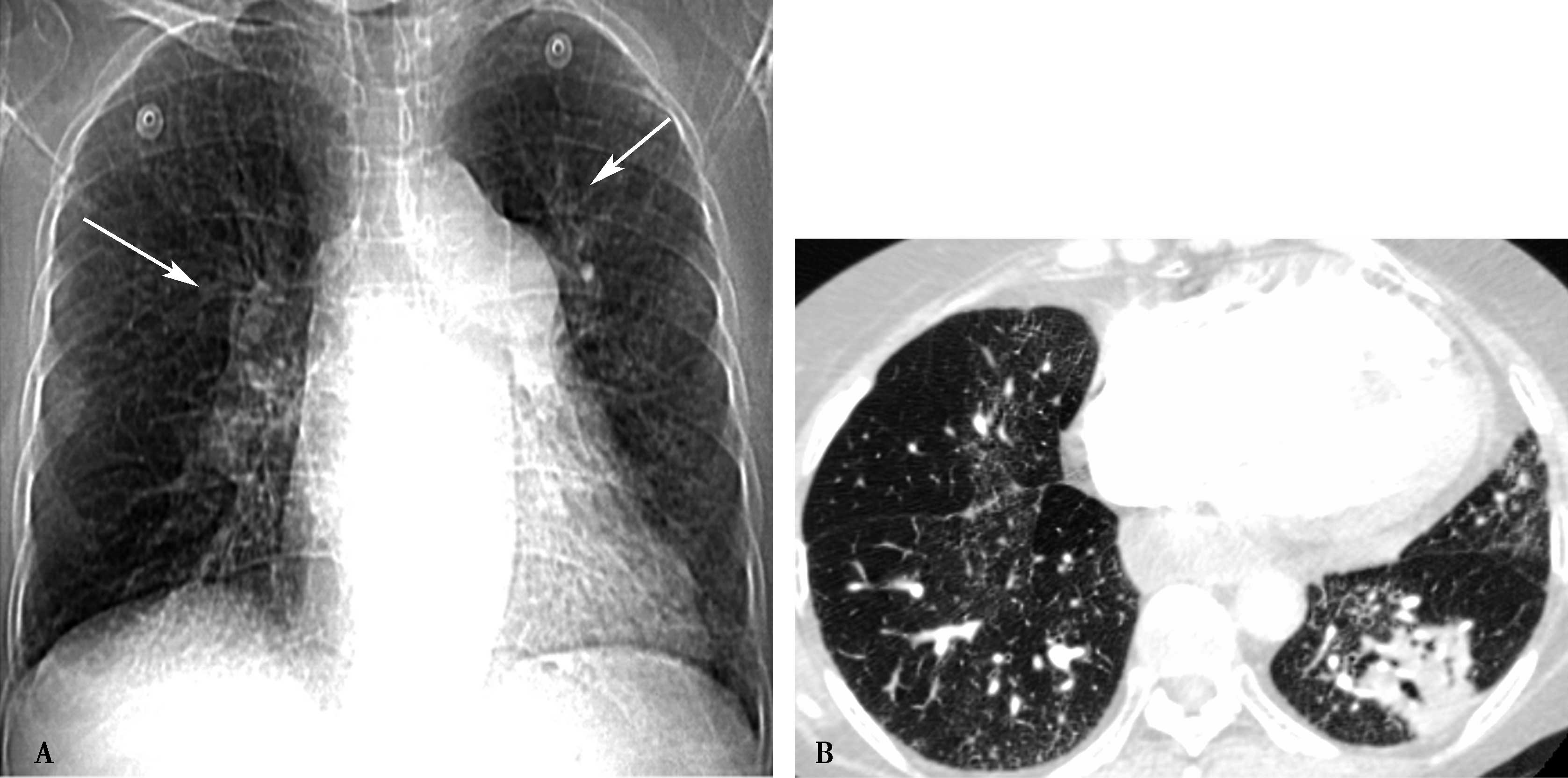 图7-2-13 女,54岁,混合型结缔组织病。A.X线胸片,示两肺透过度降低,广泛间质性改变。肺动脉段凸,右心增大,右下肺动脉增宽,肺动脉高压(↑);B.CT横断扫描,两肺不均匀磨玻璃状改变,间质改变,间质纤维化,可见间隔线,为肺小动脉炎特点