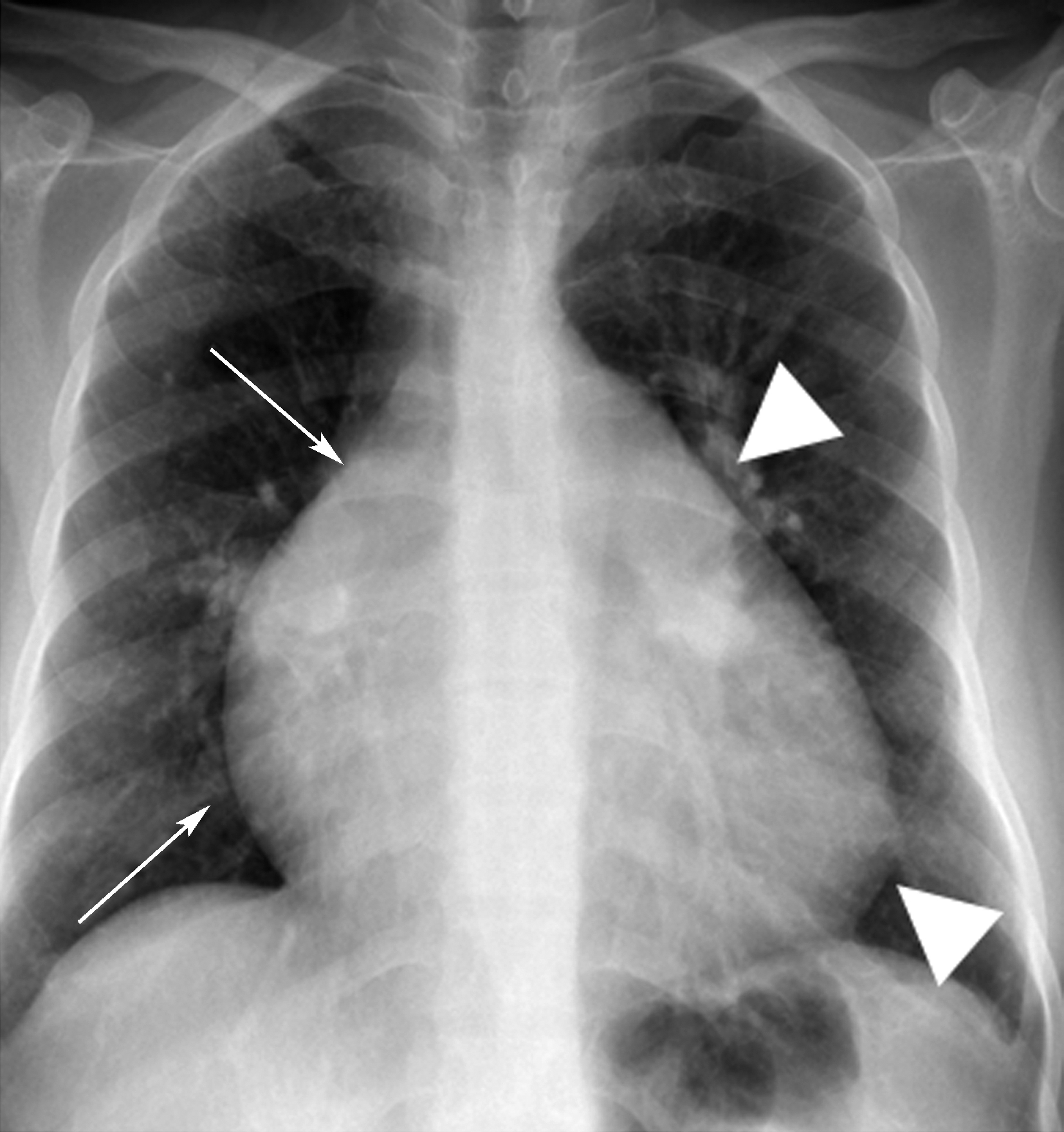 图7-1-6 右心房、室增大征象 右心房增大(↑),右心室增大(▼)