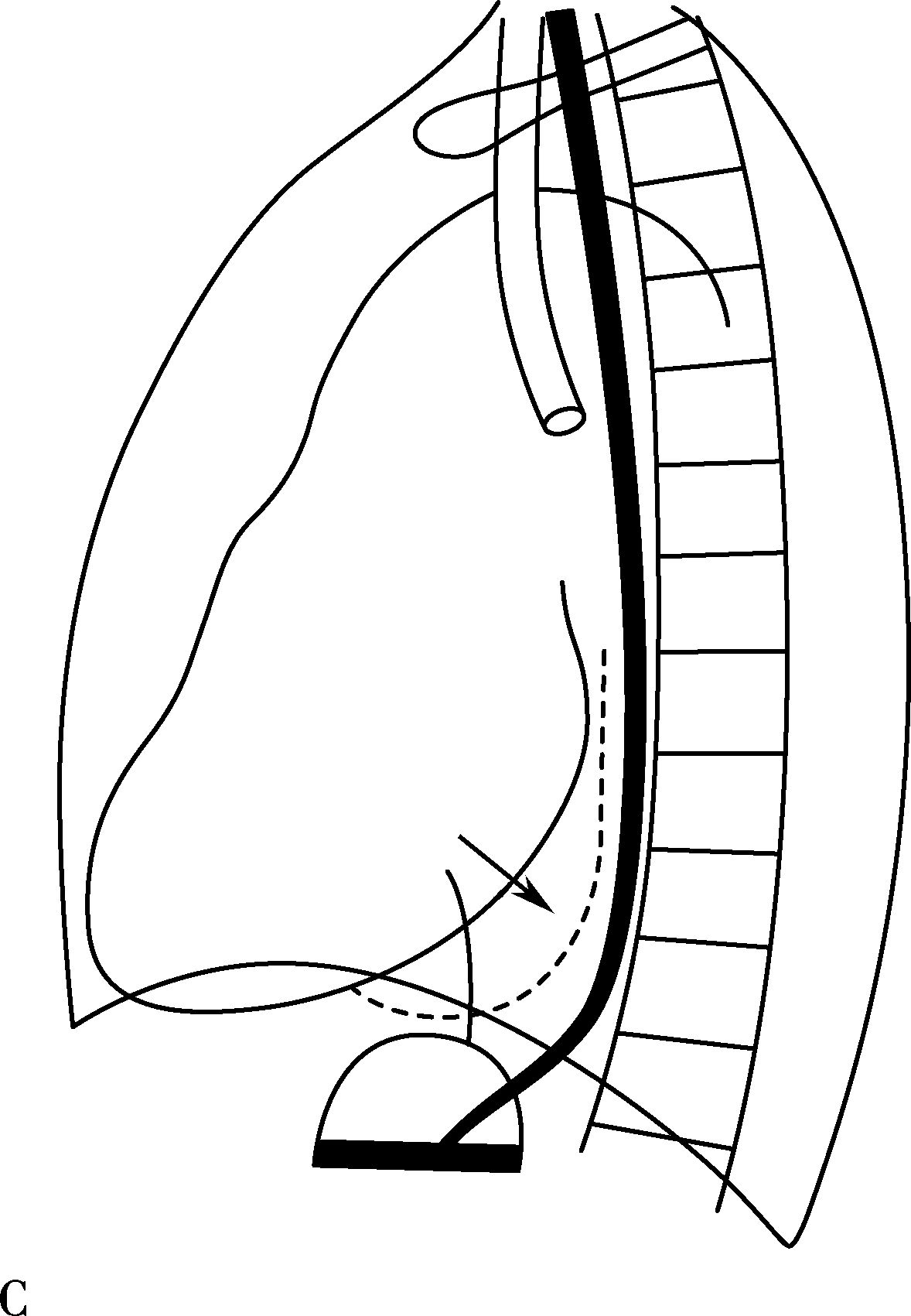 心脏后下缘向后膨隆,心后间隙消失(图7-1-3C↑)。