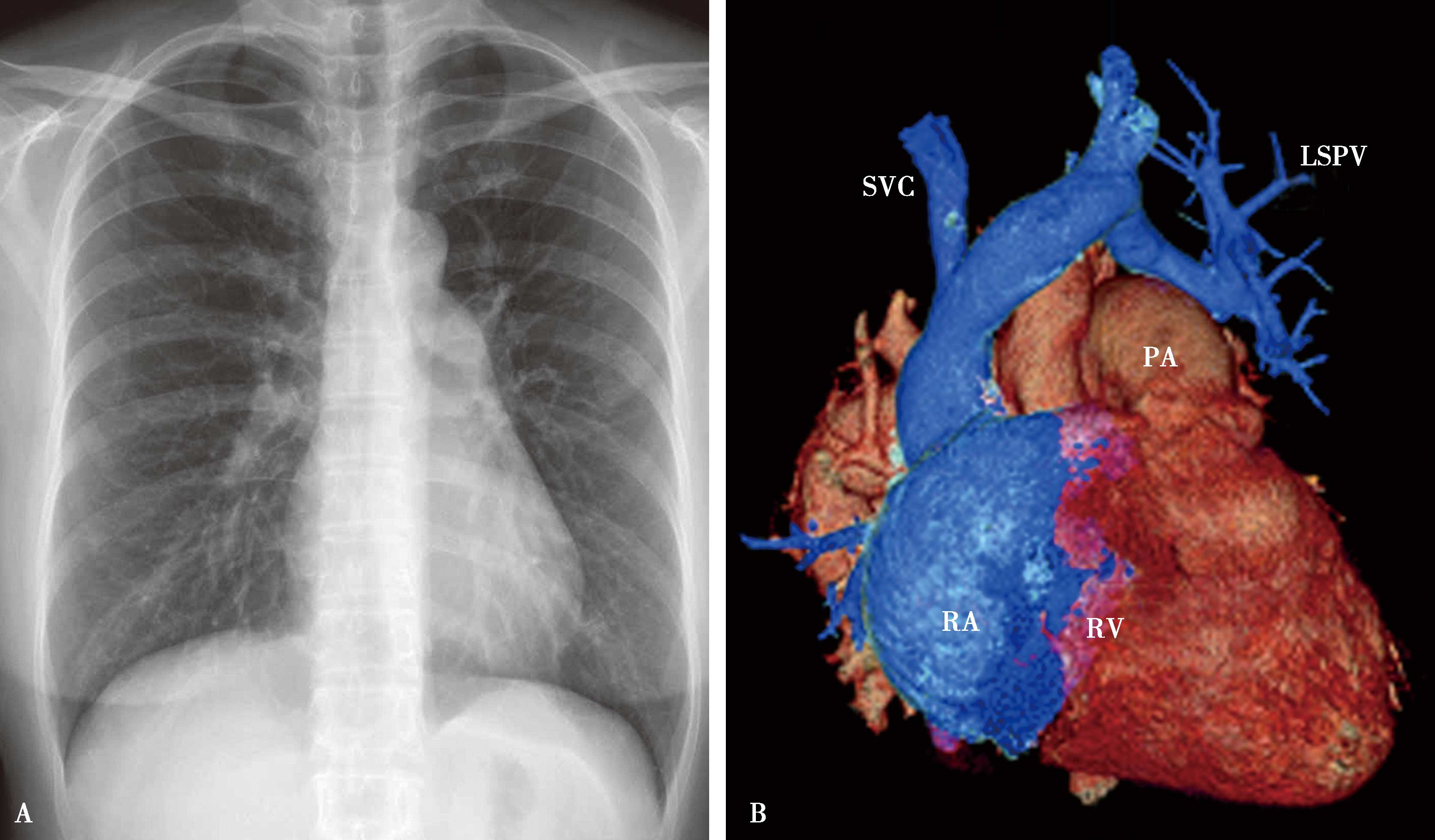 左心房耳部膨隆;气管隆突角度开大;左心房高度增大时,可以向心右缘凸出(图7-1-2A↑)。