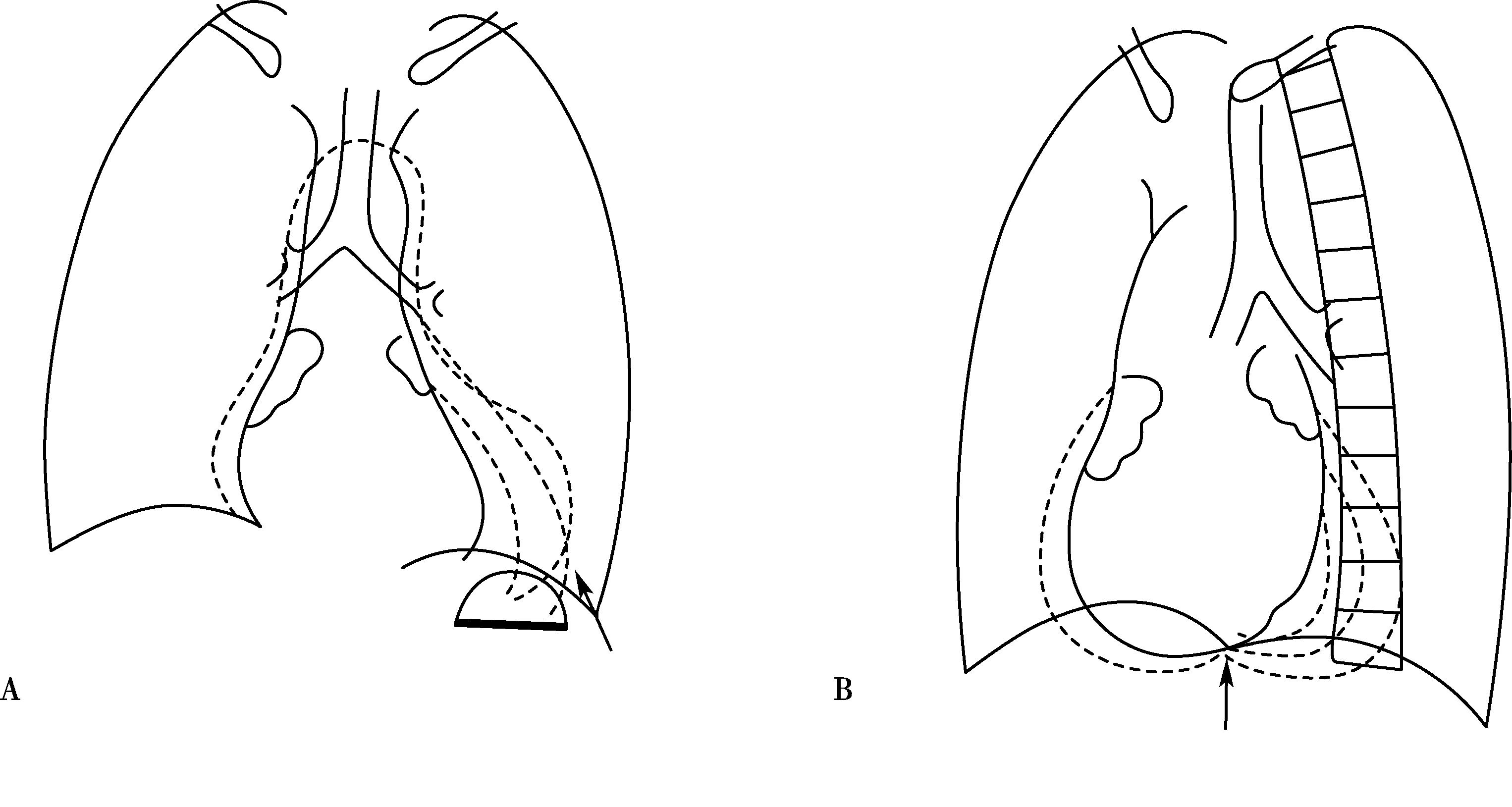 心脏后上缘膨隆,左主支气管抬高(图7-1-2B↑)。