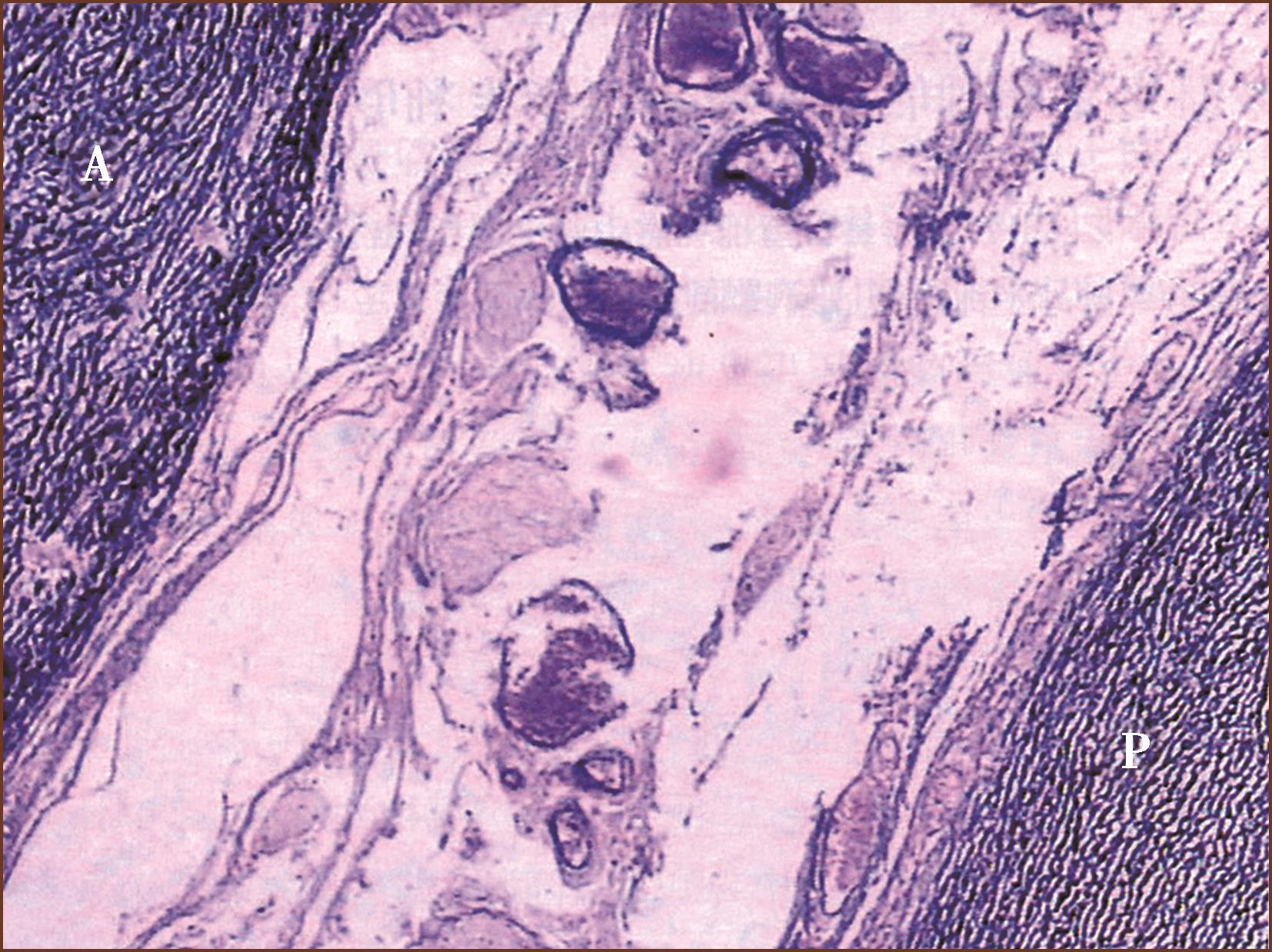 图1-3-10 正常胎儿升主动脉(A)、肺动脉干(P),具有相似的丰富的弹力纤维板(ET+VG染色,低倍放大)